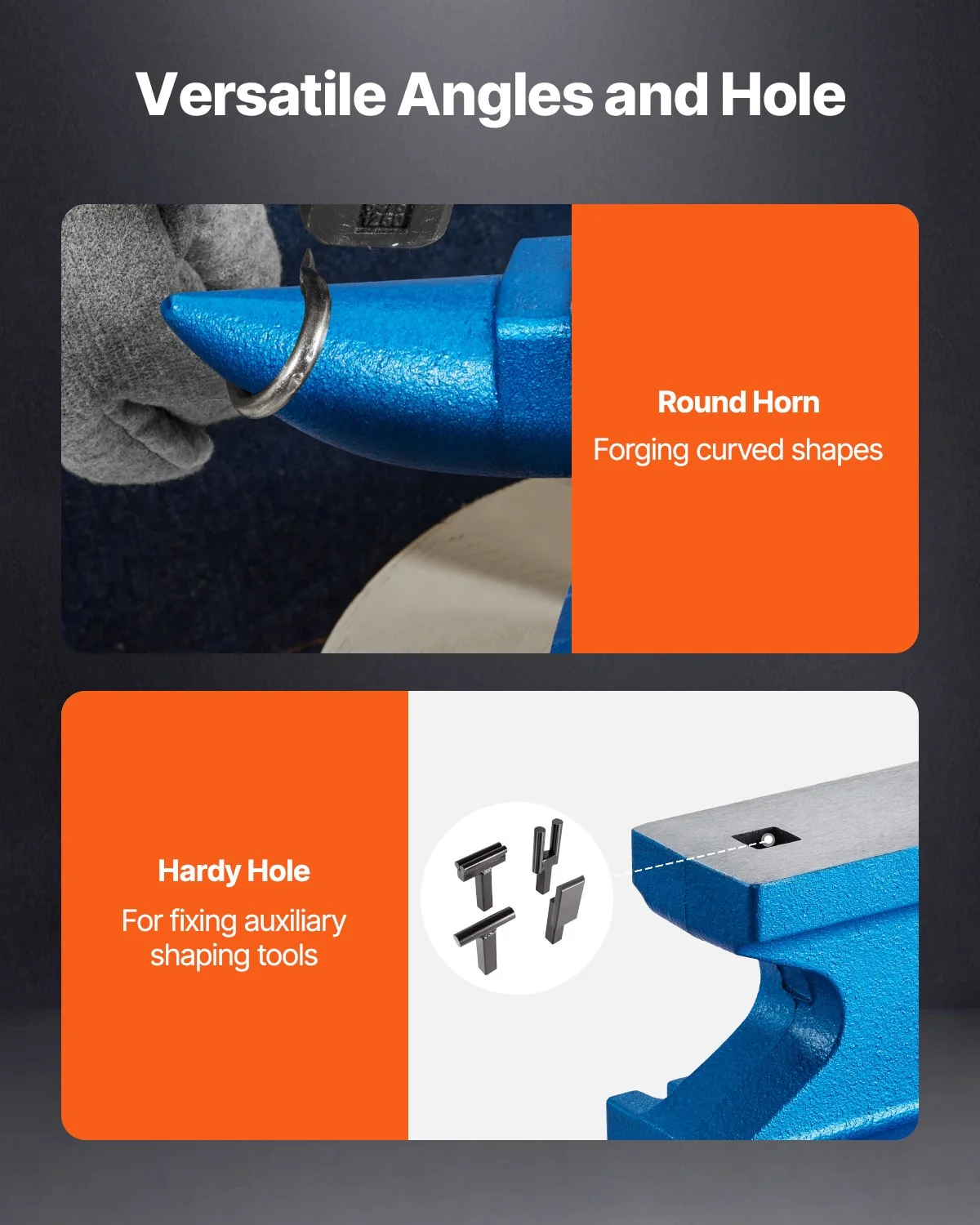 The round horn of the blacksmith anvil can be used for flatting, bending, and shaping. And the hardy hole shows a good performance in accessories’ punching and twisting.