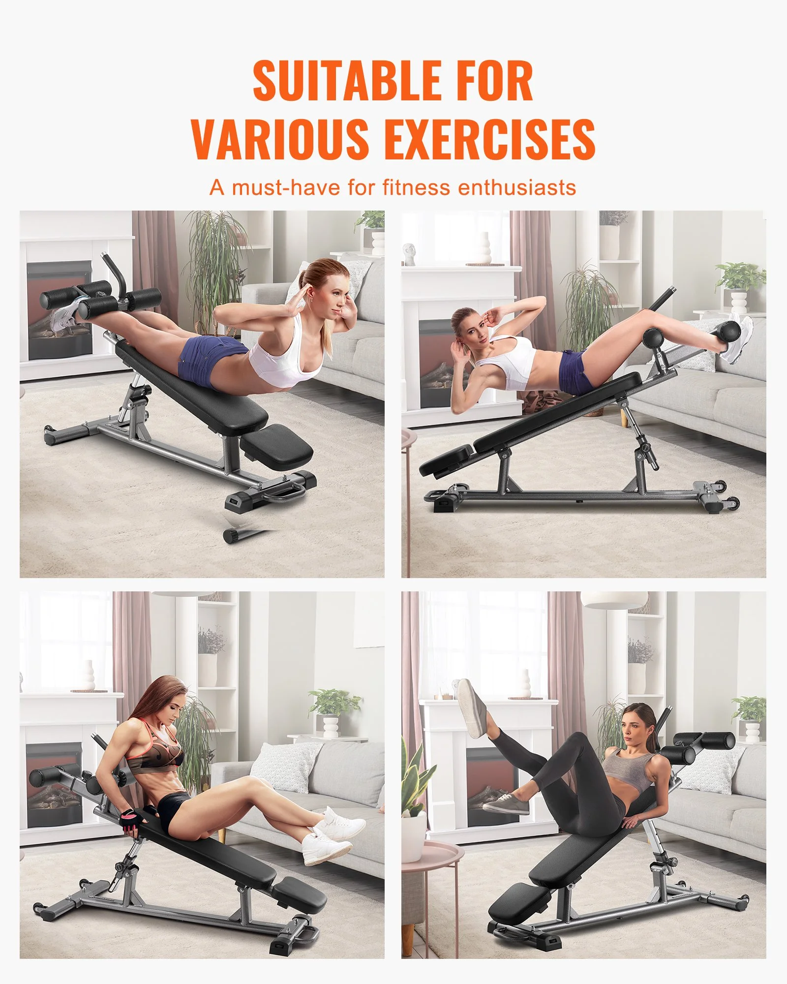 Customize your workout with 4-level height and 3-level foot hook length adjustment. This sit up bench fits users of all heights for full-body training, making it a versatile and practical addition to any home gym