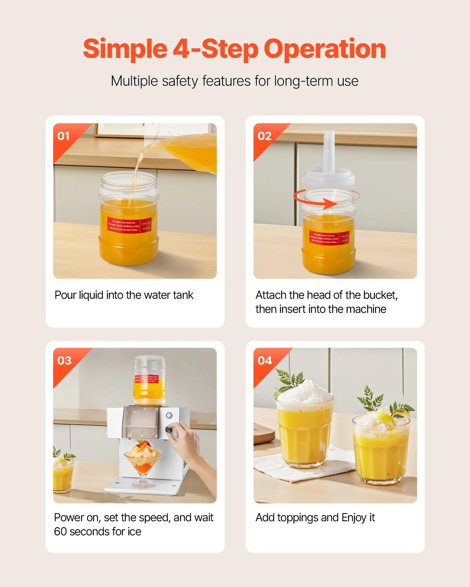 With 0-100 adjustable speeds, this snowflake ice maker lets you create different textures such as fluffy snowflake ice, thin strips, noodle-like ice, or flakes, giving you smooth and refreshing desserts every time
