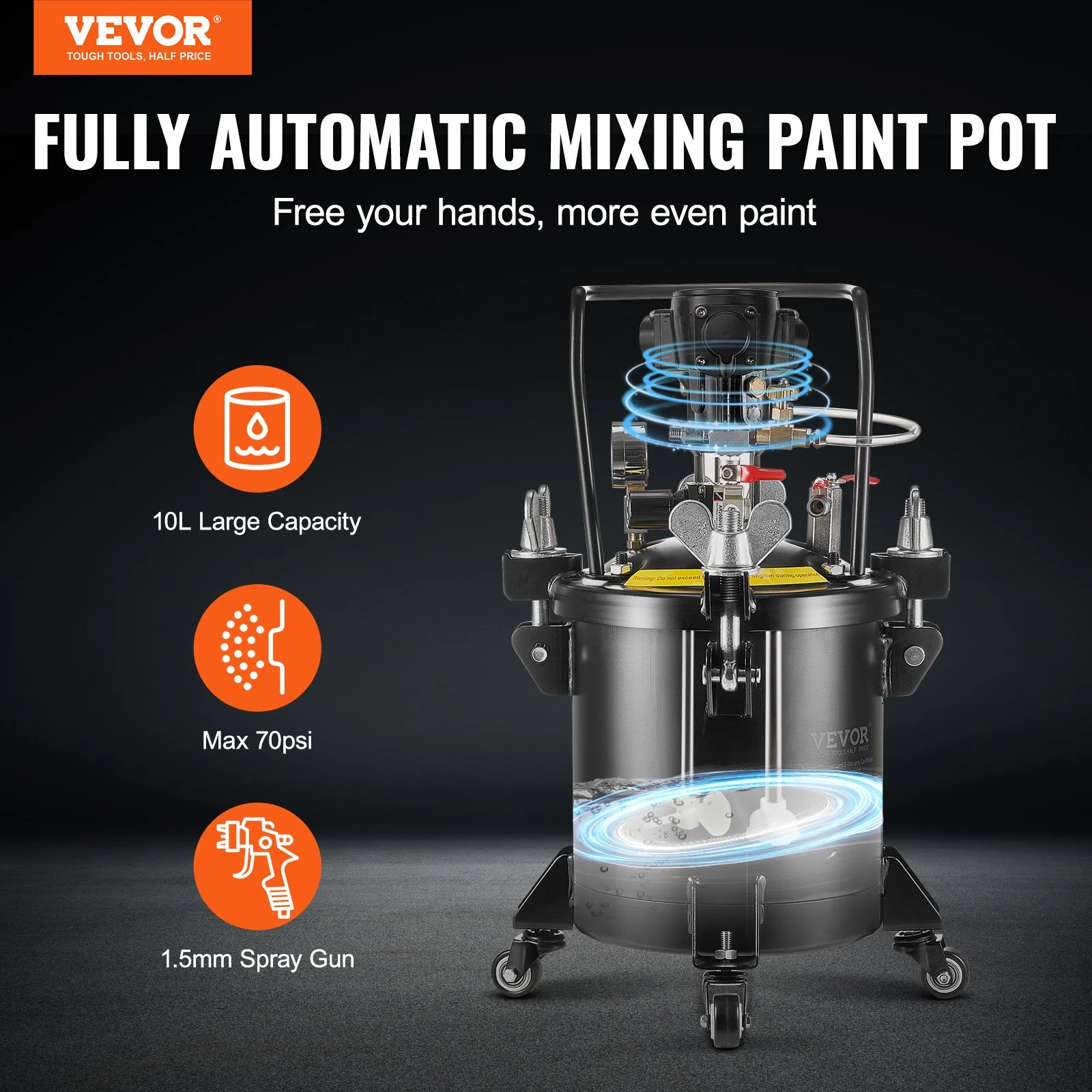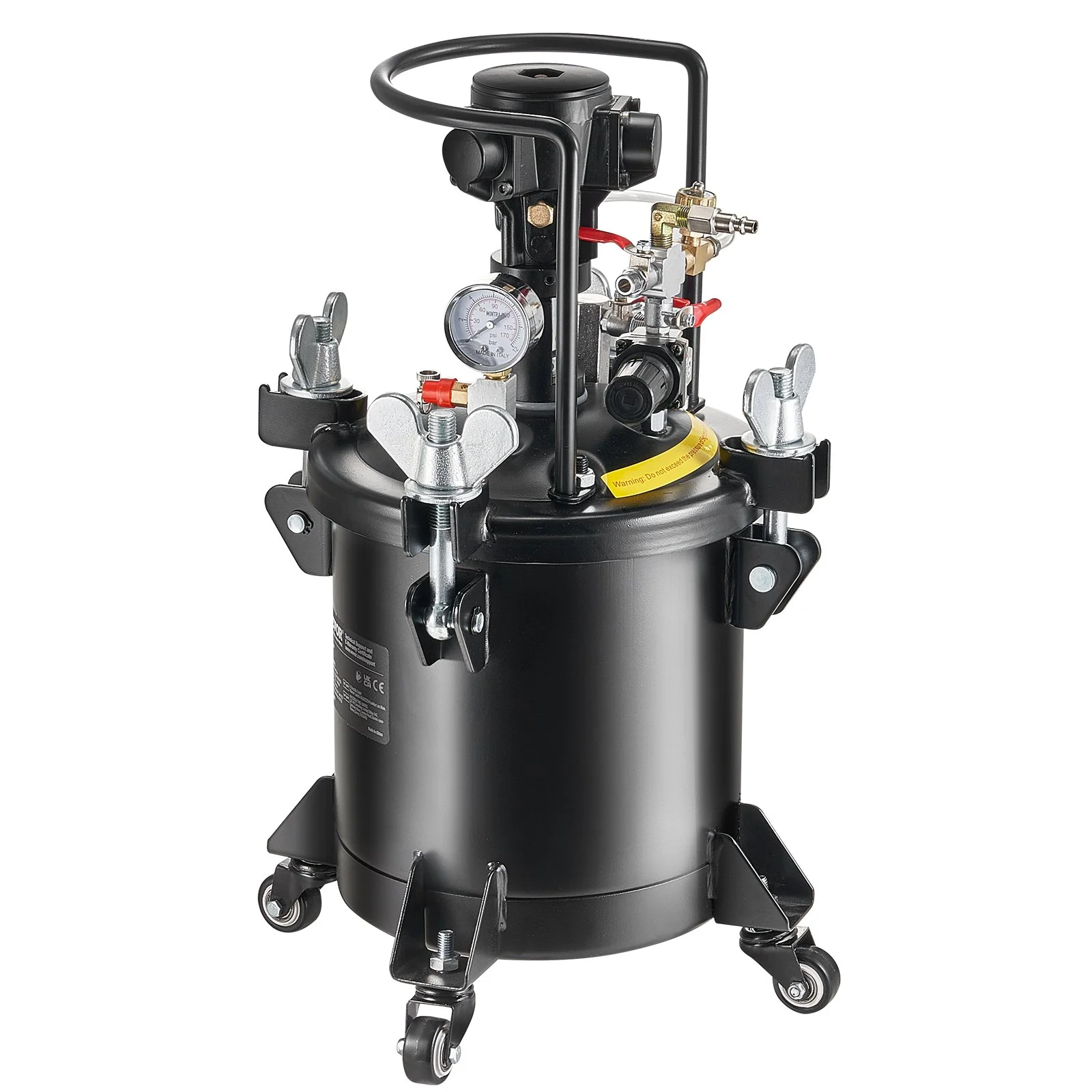 The pressure pot comes with a 1.5mm spray gun, compatible with most paints including latex, varnish, metallic, and multicolor paints. Additionally, you will receive two 3m hoses and four caster wheels, making it easier to move the pot to various work locations.