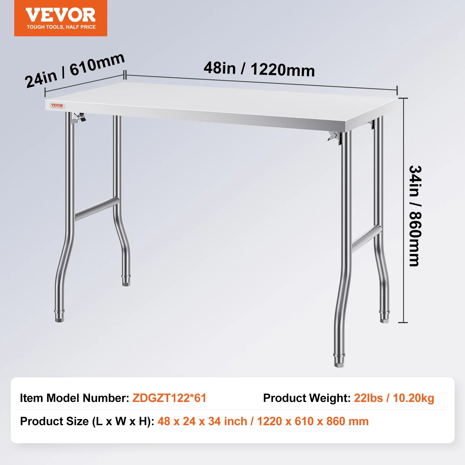 This work table, measuring 48 x 24 x 34 inch, is made from SUS201 stainless steel for the tabletop, shelves, and legs. It offers superior rust resistance, a sleek appearance, and a smooth surface that is easy to clean with a simple wipe. NSF certified, it meets strict public health standards, ensuring long-lasting protection for your health.