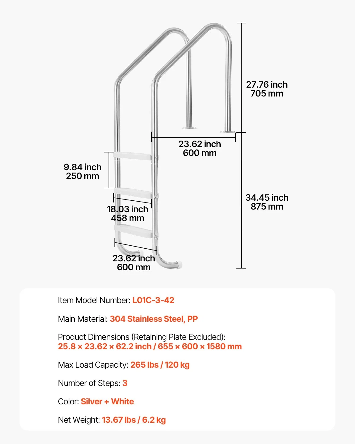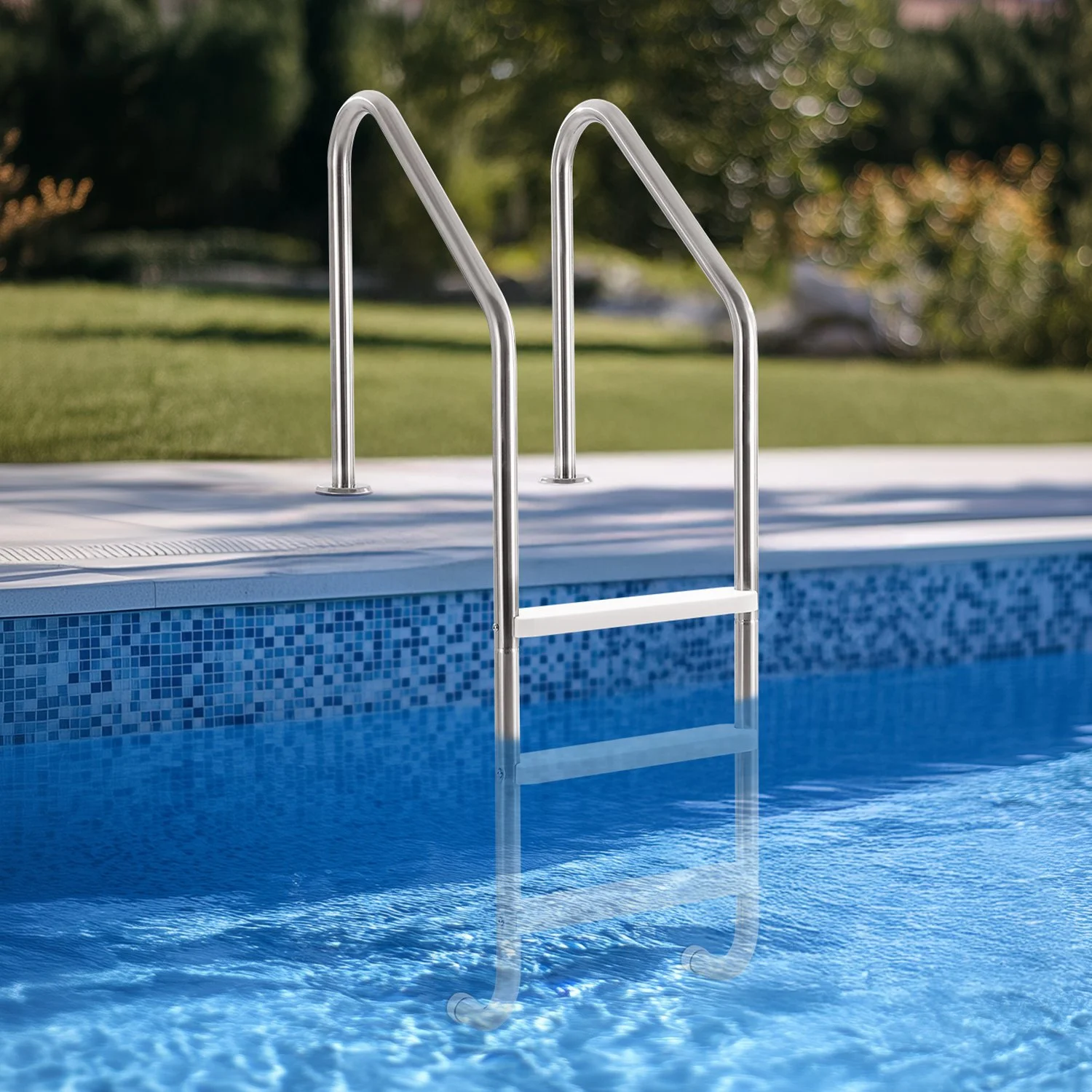 This pool ladder features 3 steps and double handrails on both sides. Each step is equipped with a non-slip rubber mat, ensuring secure entry and exit from the pool, even underwater, avoiding accidental slips, ideal for 48-54 inches in-ground and above-ground pools
