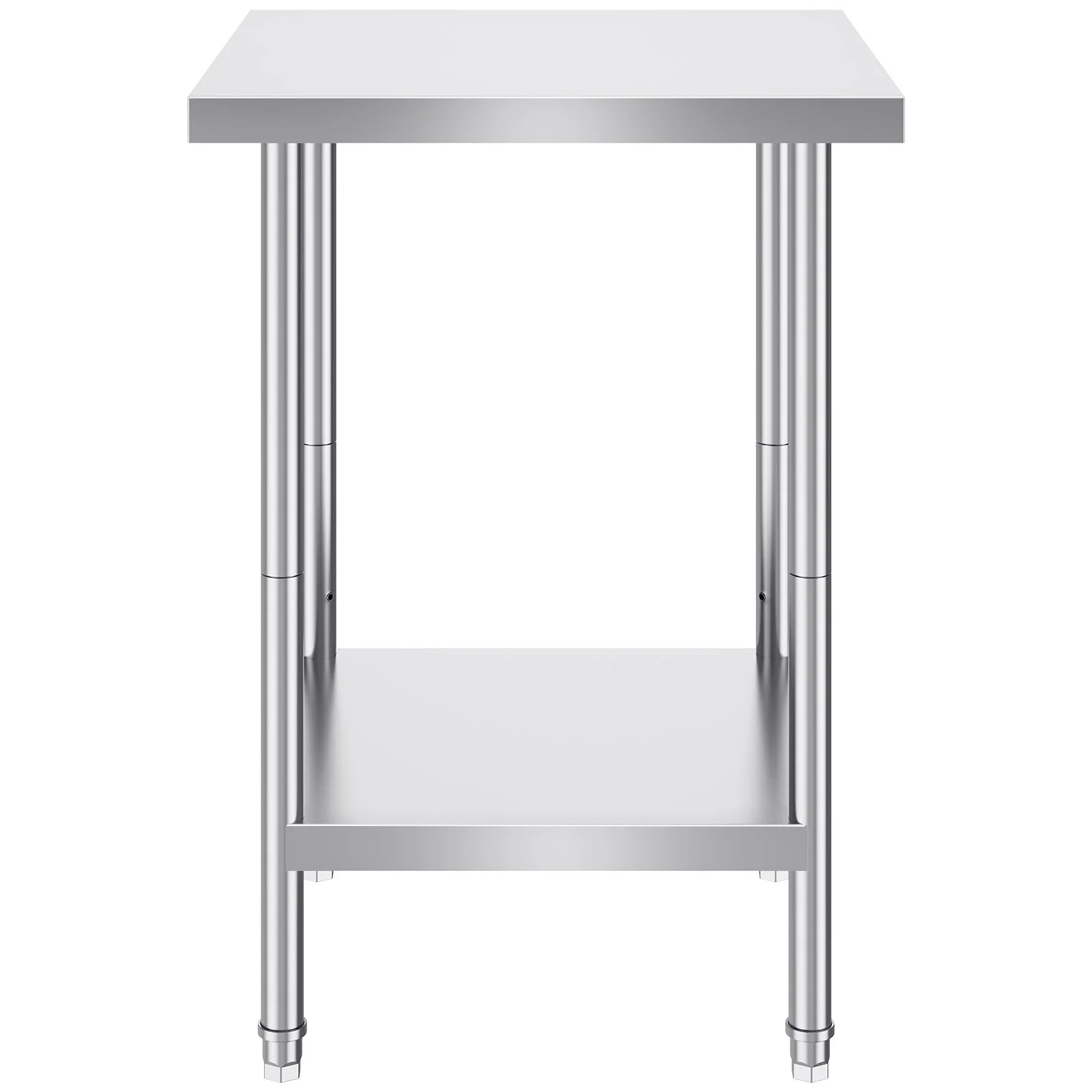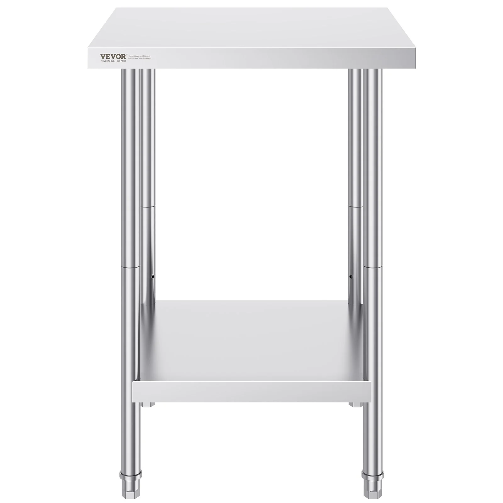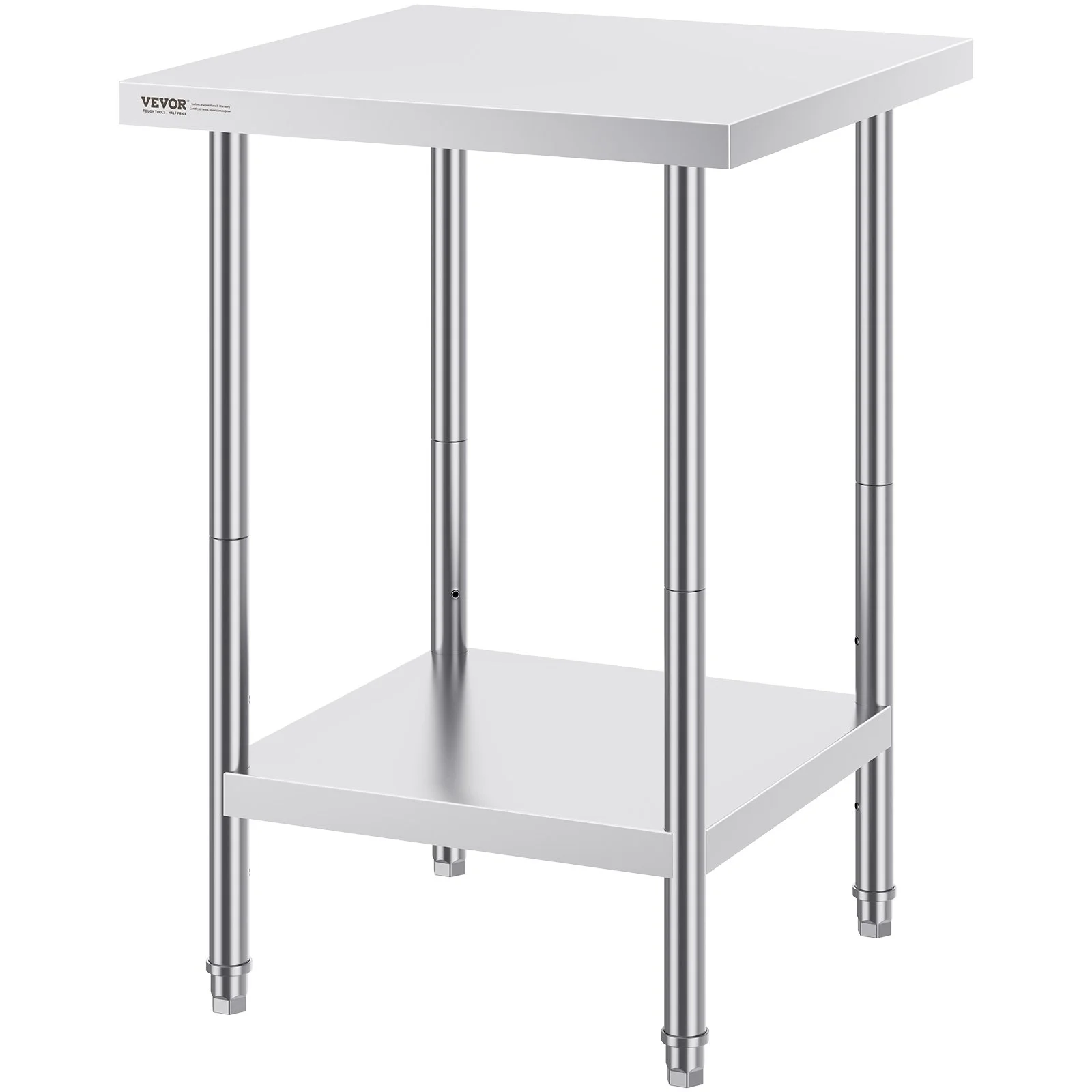 This work table, measuring 24 x 24 x 34 inch, is made from SUS201 stainless steel for the tabletop, shelves, and legs. It offers superior rust resistance, a sleek appearance, and a smooth surface that is easy to clean with a simple wipe. NSF certified, it meets strict public health standards, ensuring long-lasting protection for your health.