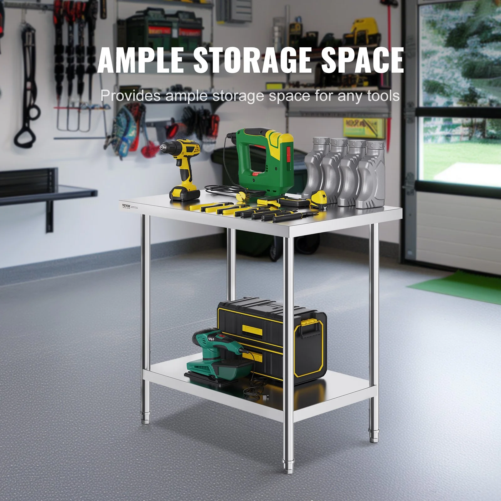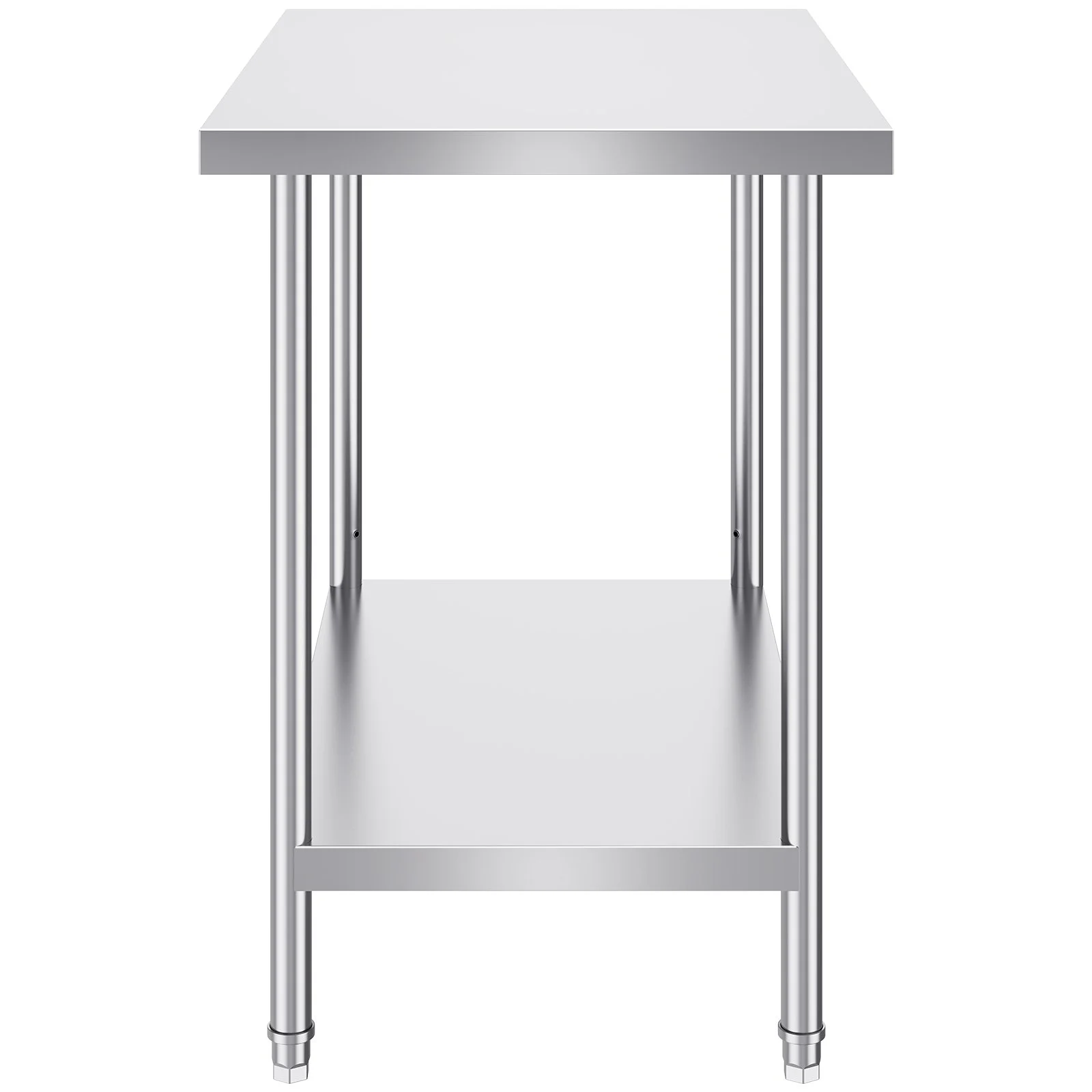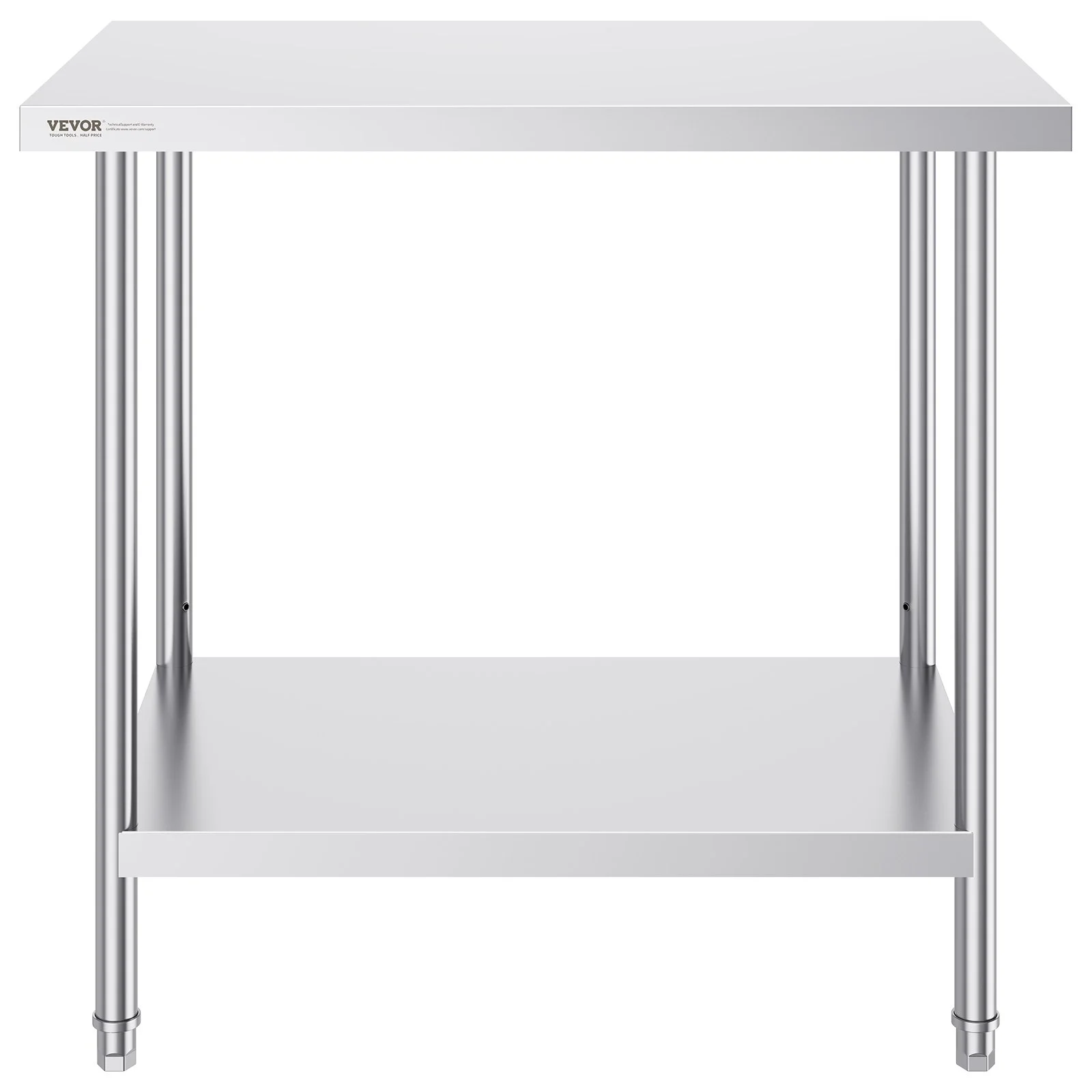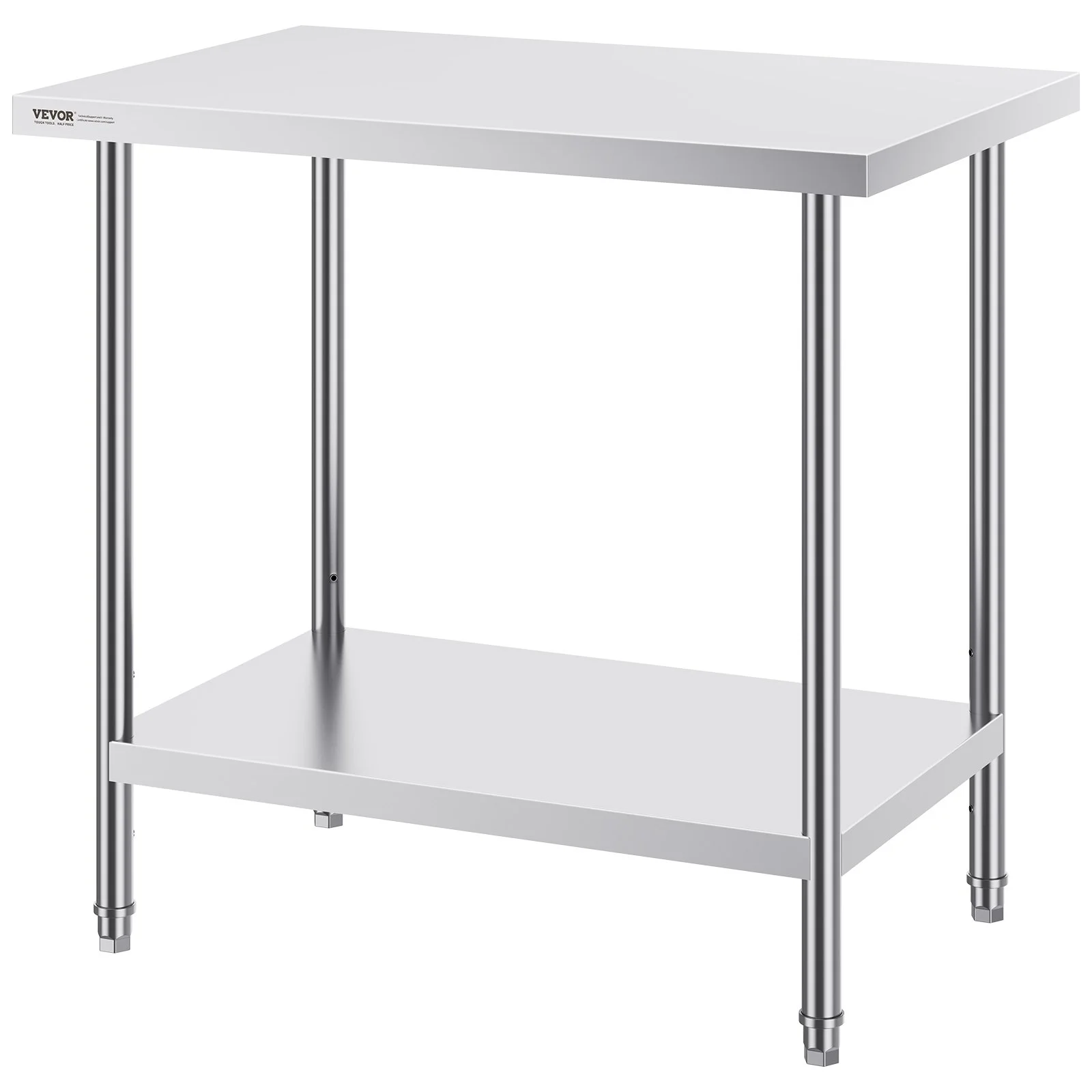 This work table, measuring 24 x 36 x 34 inch, is made from SUS201 stainless steel for the tabletop, shelves, and legs. It offers superior rust resistance, a sleek appearance, and a smooth surface that is easy to clean with a simple wipe. NSF certified, it meets strict public health standards, ensuring long-lasting protection for your health.