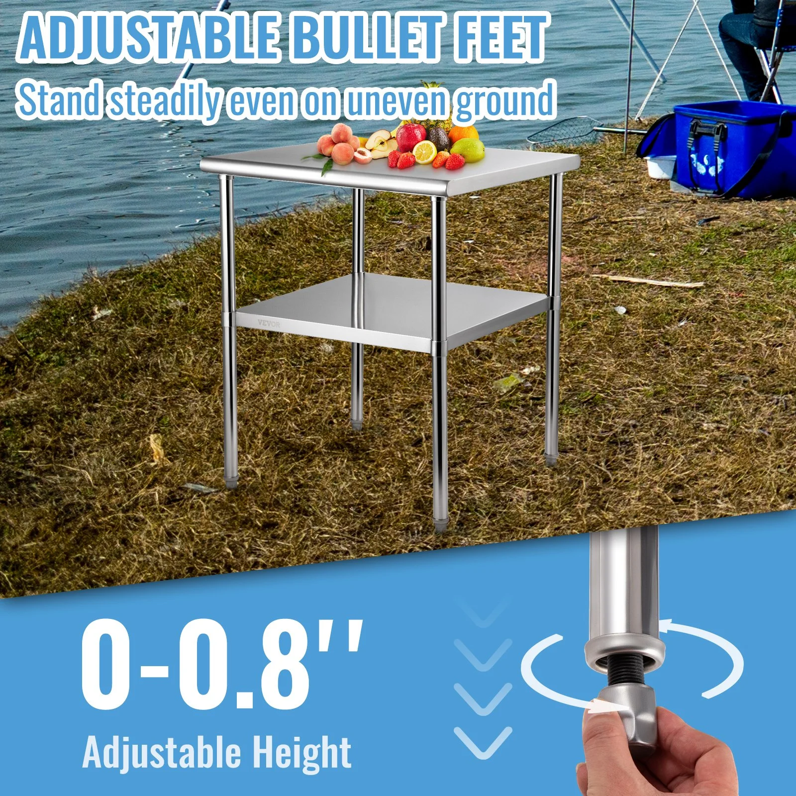 This prep table contains adjustable feet, and it��s free for you to adjust the feet�� height between 0-0.8 inches to stay stable on uneven grounds. The front and back of this workbench are designed with rounded edges to maximize working comfort. It can be used in the kitchen, garage, backyard, garden, etc. Where will you place your new prep table?