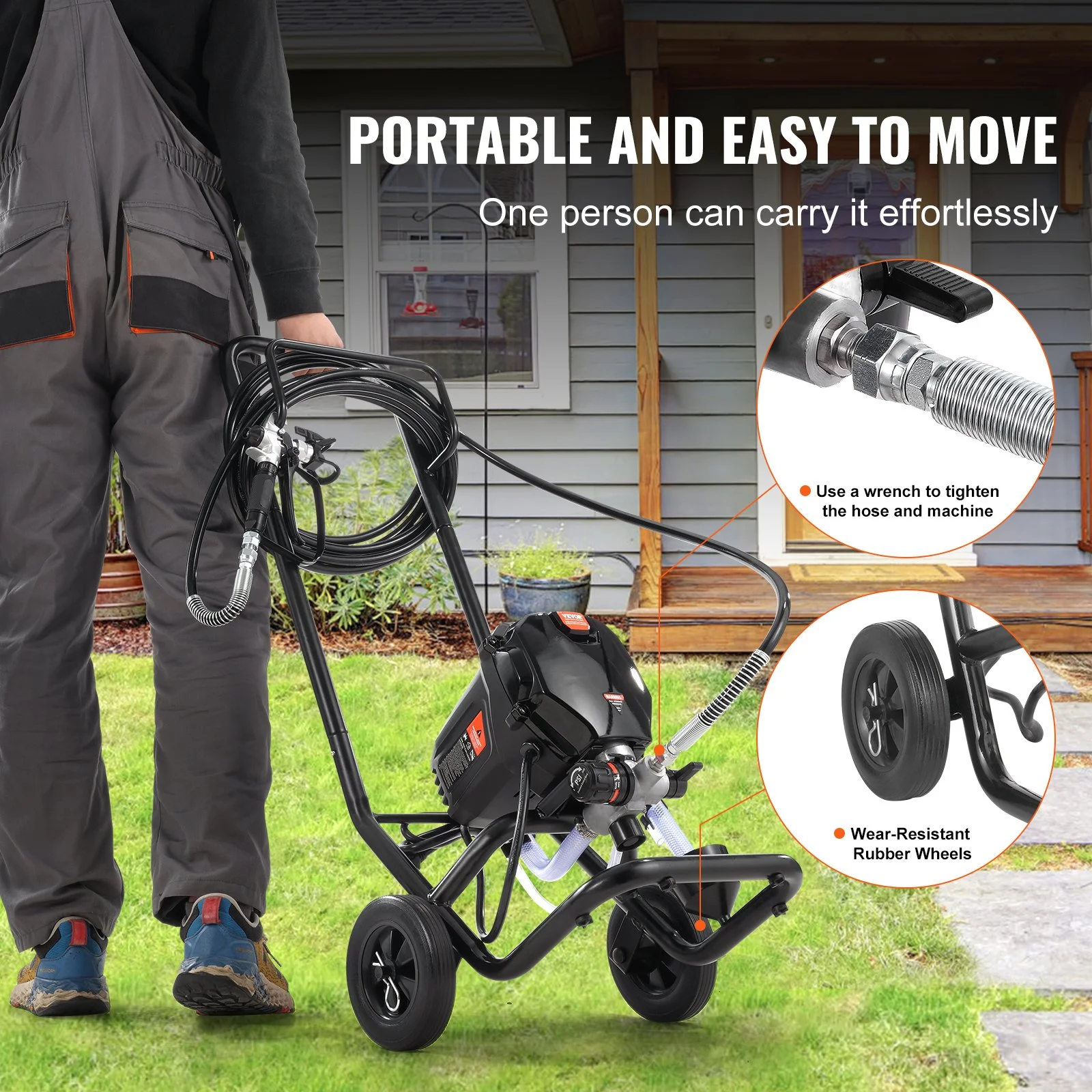 The wheeled design allows you to easily move the paint airless sprayer to any location. The pump body is detachable for easy cleaning with the included cleaning brush, making it easy to clean crevices and corners. You can also use the extension pole for high or ground-level work, reducing the burden of bending or climbing.