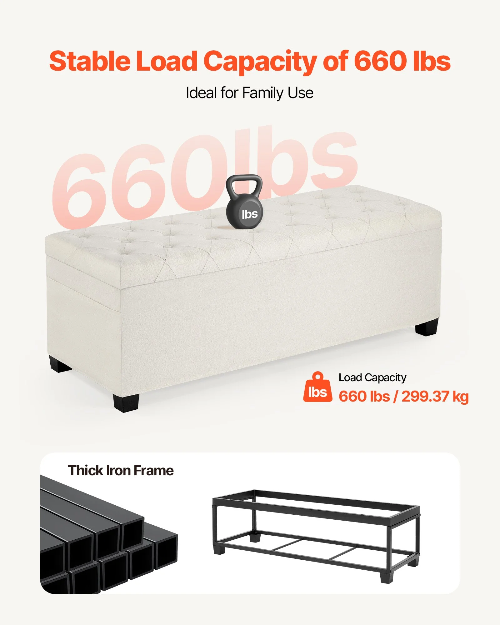 Supporting up to 660 lbs/299 kg, the storage ottoman features a reinforced iron frame and premium MDF structures to ensure long-lasting use without deformation or wobble. It provides reliable support for seating and storage
