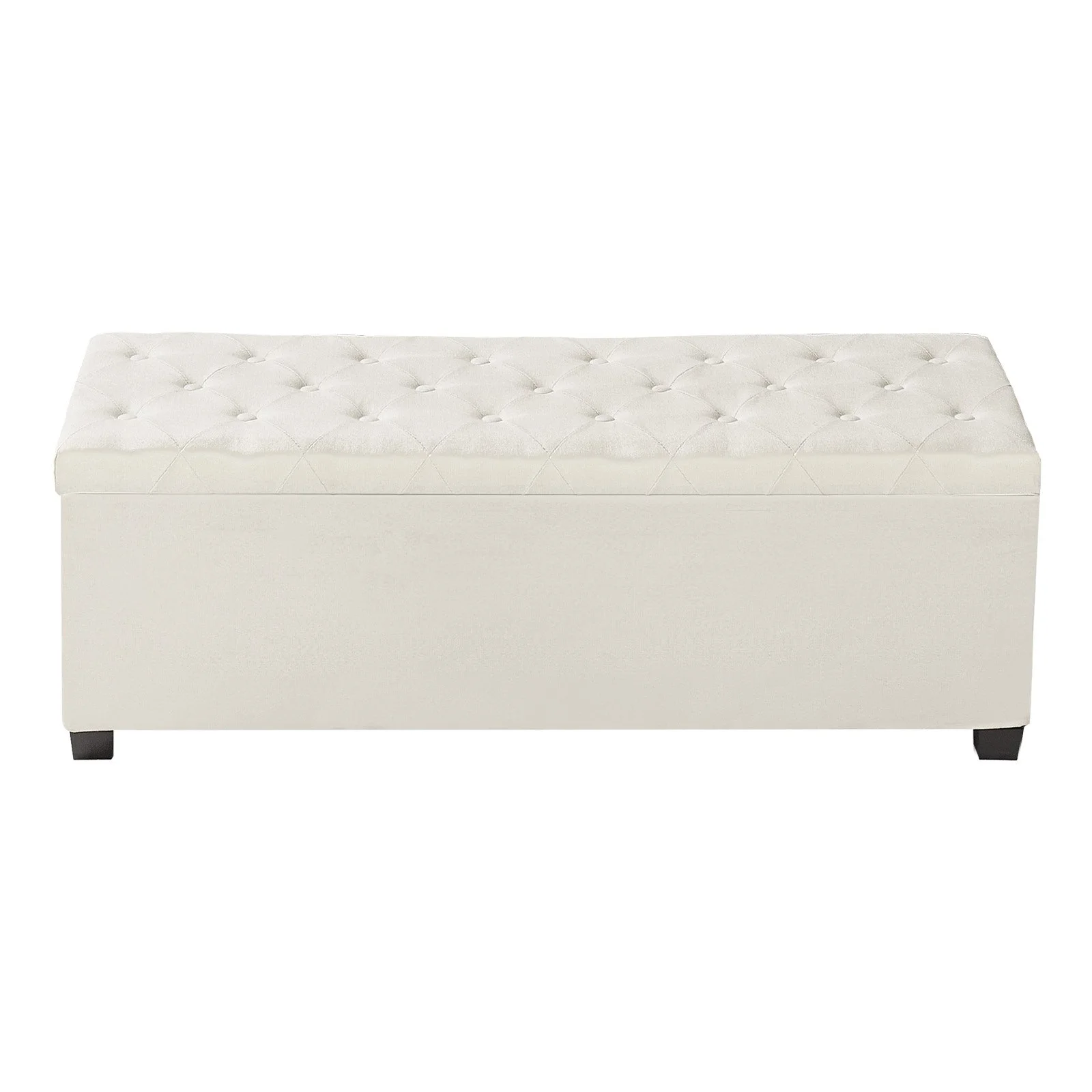 The storage bench provides an interior for bedding, blankets, and daily items. Two storage spaces keep items organized, while side pockets hold remotes, books, and tissues, and the hinged lid enables convenient access