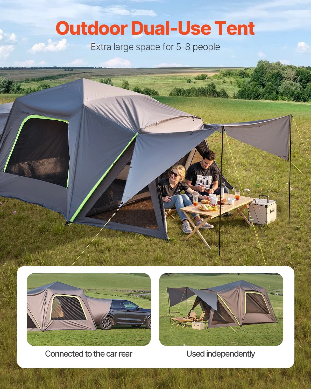 With a generous size of 10.0 x 10.2 x 7.5 ft (3050 x 3100 x 2300 mm, excluding the porch), this SUV car tent also features a 7.0' x 6.2' extendable canopy, providing ample room for 5-8 people. It’s ideal for family and friends to enjoy a comfortable outdoor camping experience.