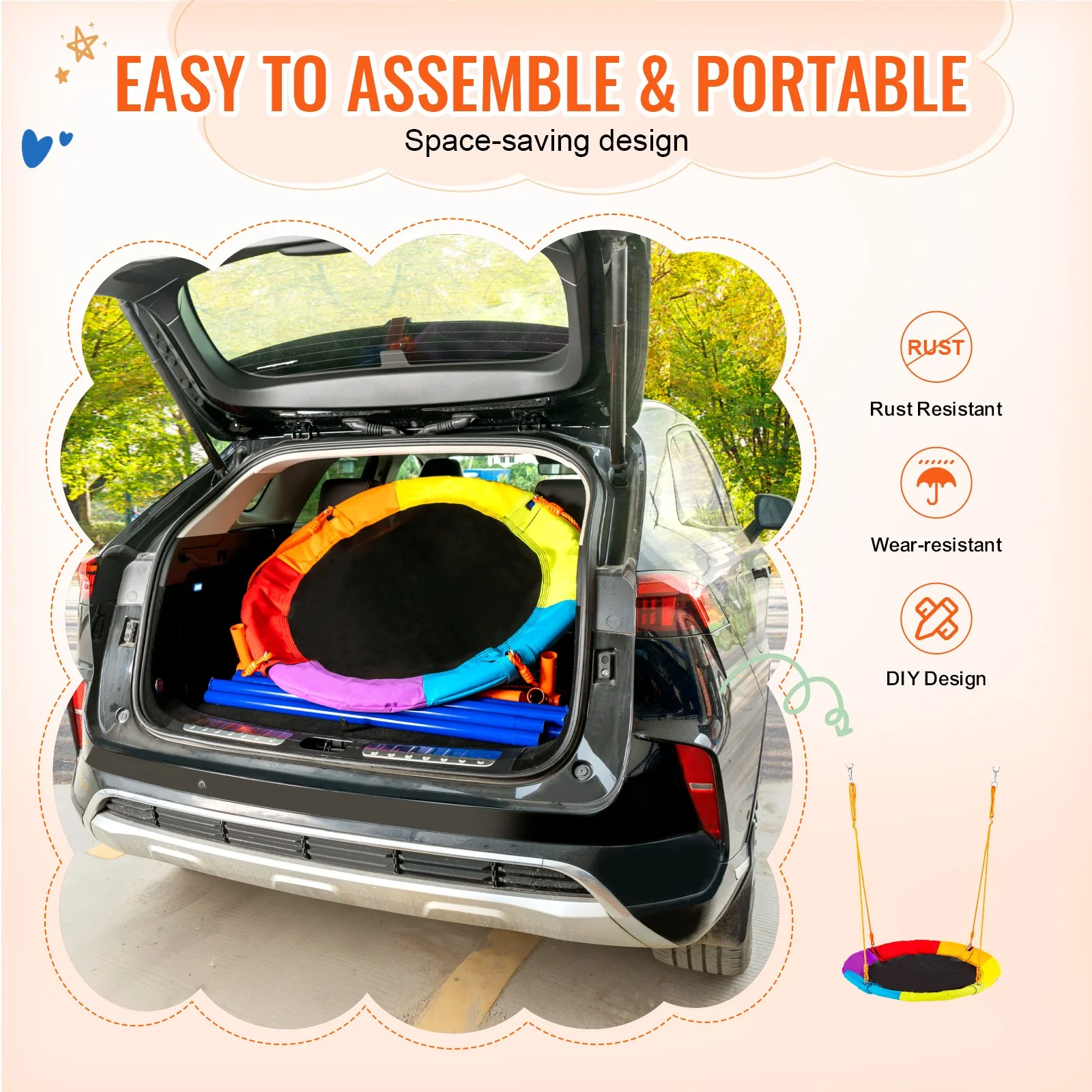 Our swing sets for backyard come with a high-quality Oxford fabric seat, known for durability and colorfastness. They are resistant to wear and tear even after prolonged use. Adjustable high-quality PE ropes are sun-resistant and do not fade over the years.