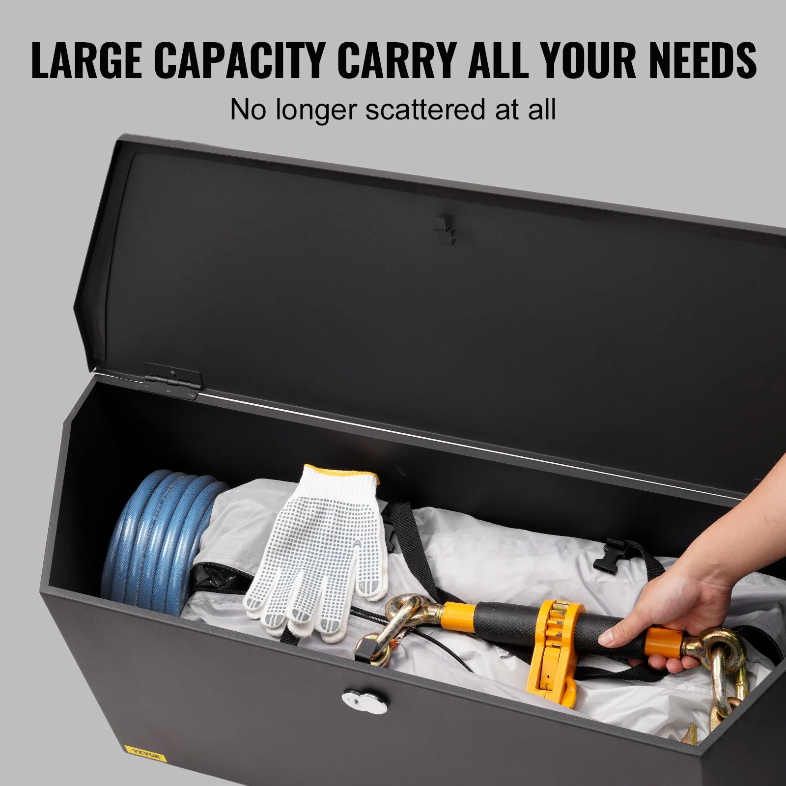 Our trailer tongue box provides a spacious 36 × 12 × 12 inch /914 × 305 × 305 mm storage space that effortlessly accommodates batteries, tools, outdoor equipment, and more. So say goodbye to the frustration of rummaging around and being unable to locate your essentials during emergencies.