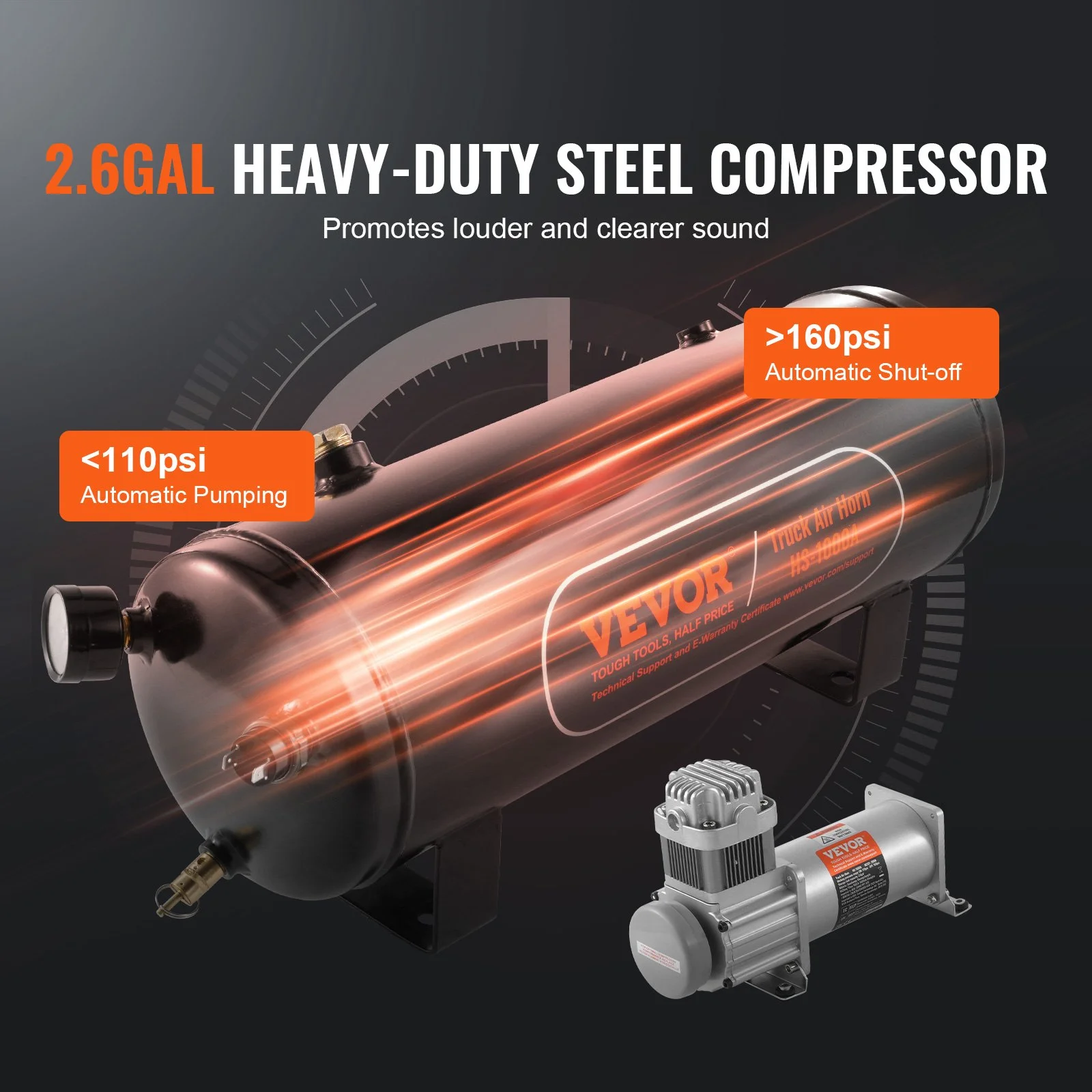 Our train horn kit delivers a robust 150dB sound with strong penetration. Ideal for long-distance driving, sharp turns, and adverse weather conditions. It effectively alerts cars, pedestrians, and animals. The electric train horn kit includes 4 trumpet air horns, a solenoid valve, a 2.6-gallon tank, a compressor, and pipes. (Note: Power switch and cord not included.)