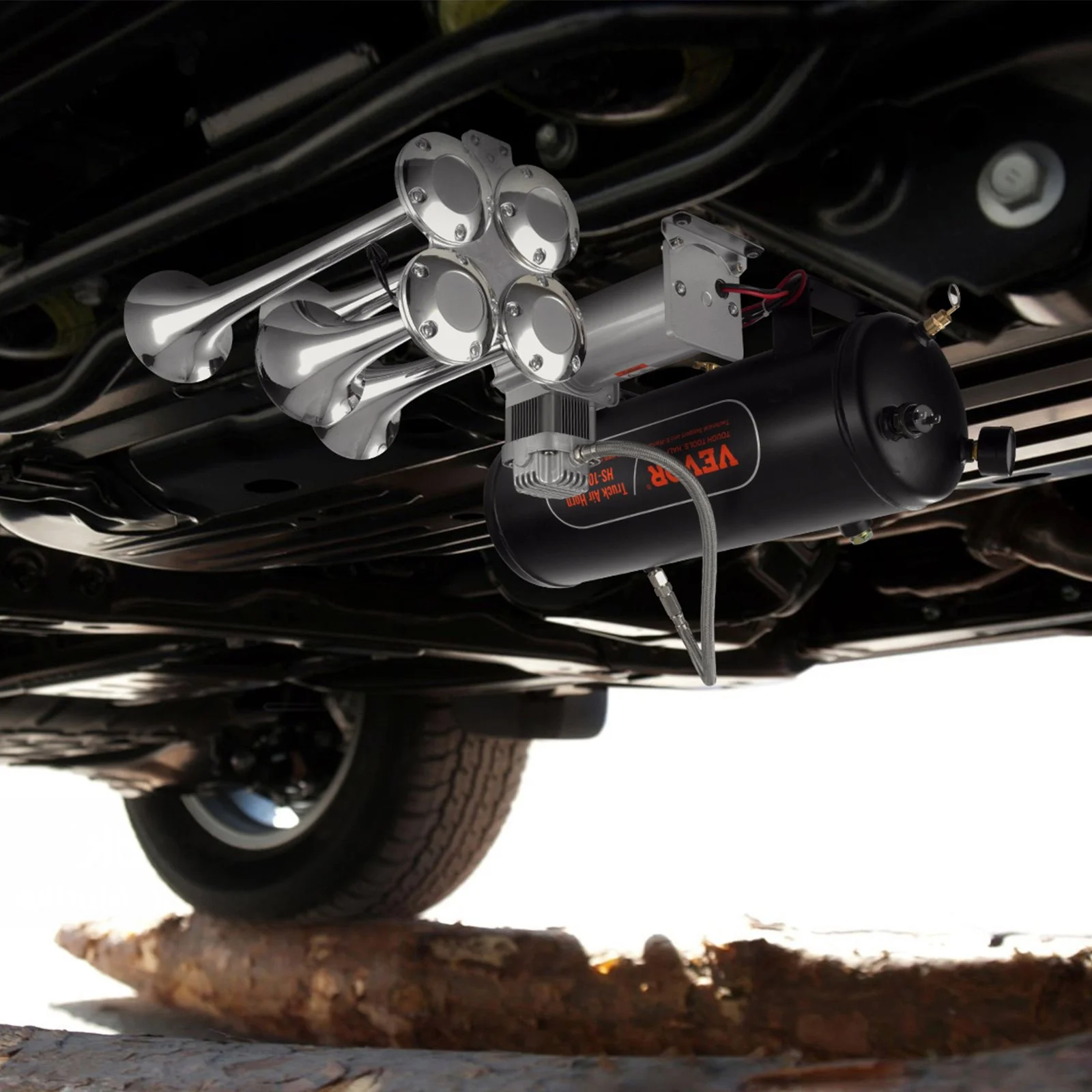 The 4 trumpet train horn kit includes a thick rubber cushion for noise reduction and enhanced stability when installed between the tank and vehicle bottom. The PA gas pipe withstands temperatures up to 120℃, and the motor is equipped with a 100℃ temperature control overload protection, ensuring safe operation in various weather and road conditions.