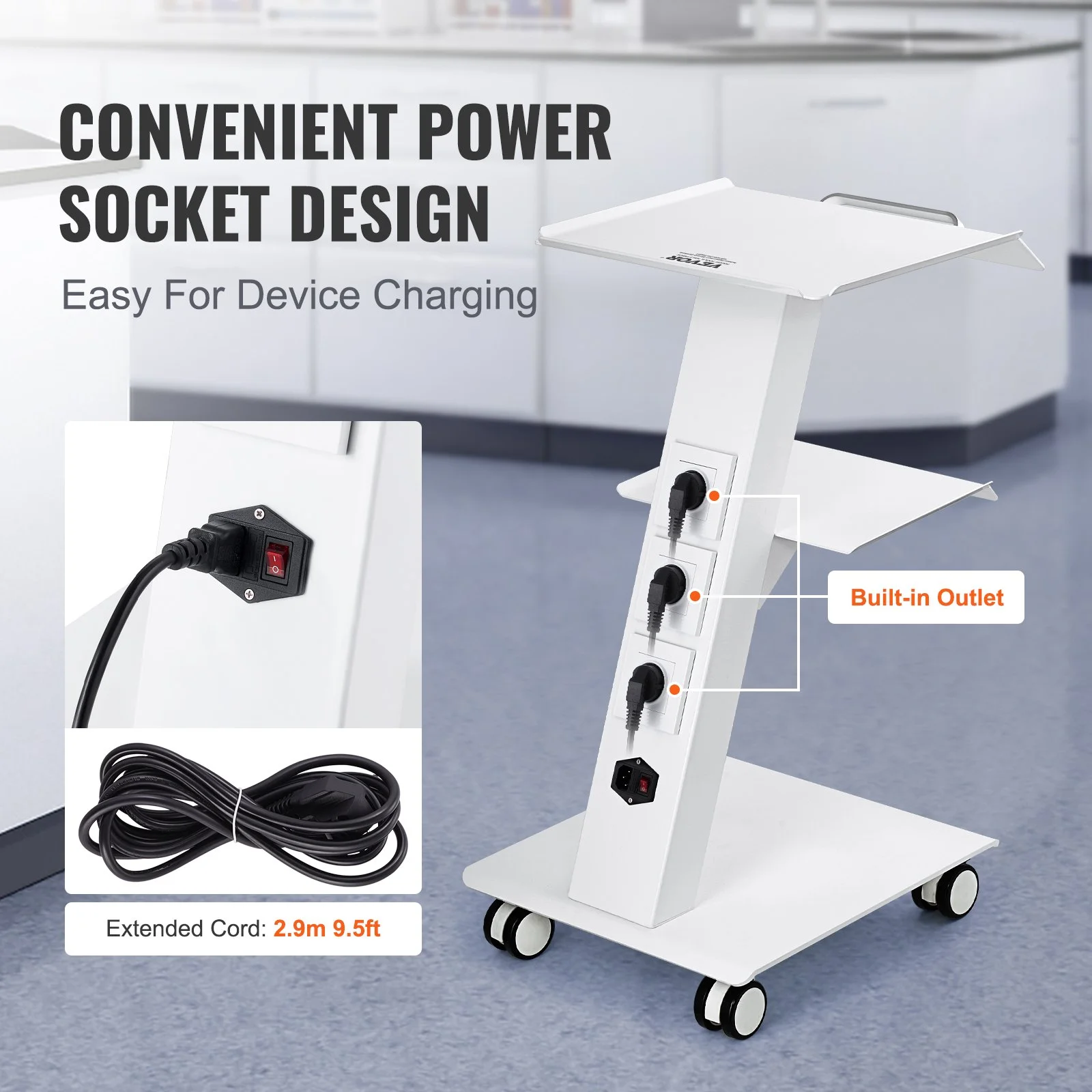 This mobile trolley has a built-in socket attached to the side, and comes with independent outlets, suitable for the simultaneous use of several devices. With a long power cord, this lab utility cart gets easy access to places that are hard to reach.