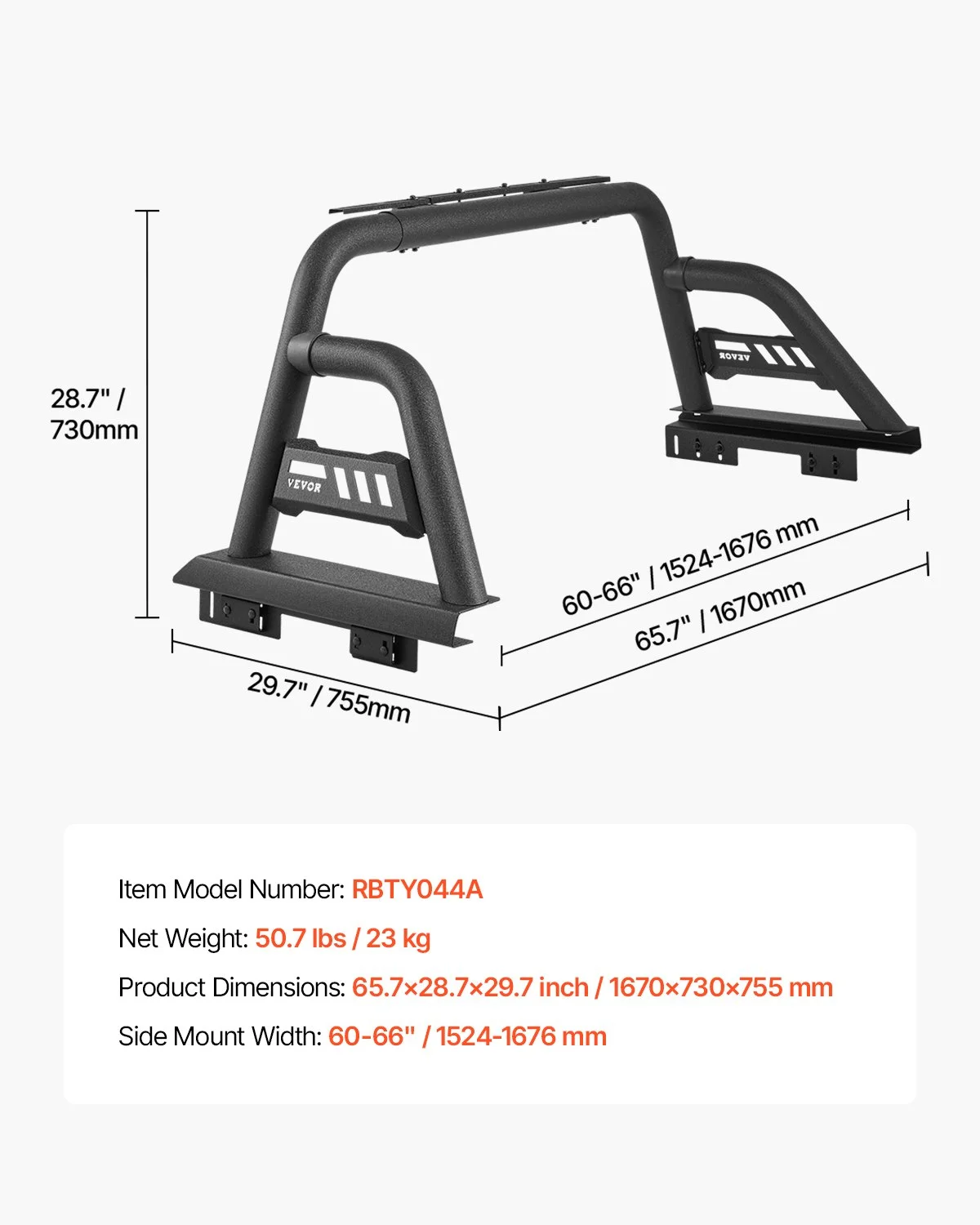 Our trucks bed rack roll bar is cleverly designed, with adjustable side mounting plates that can be flexibly adjusted from 60-66 inch / 1524-1676 mm, ensuring an ideal fit for full-size pickup trucks