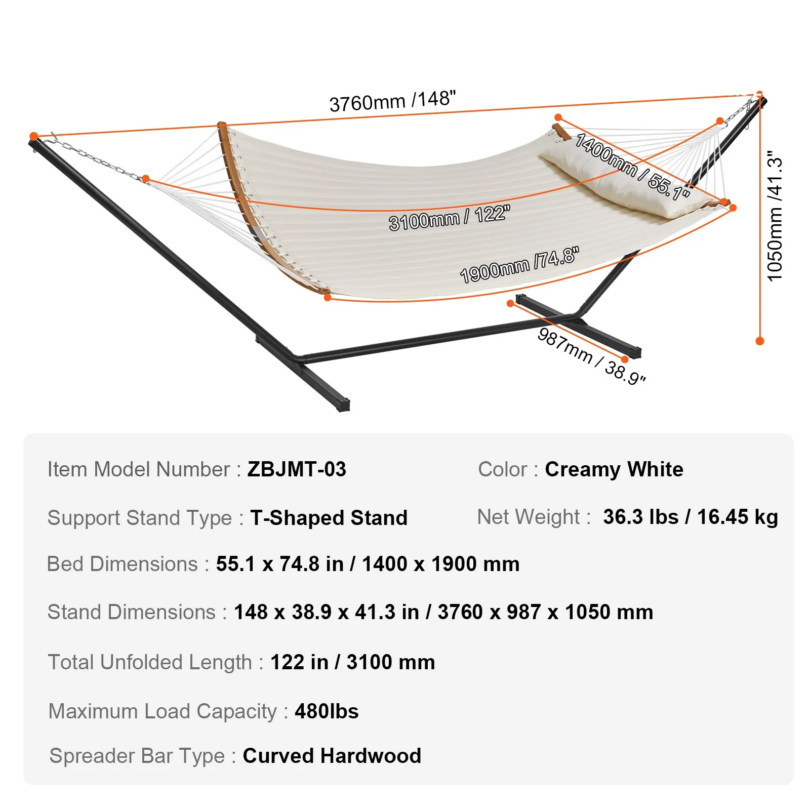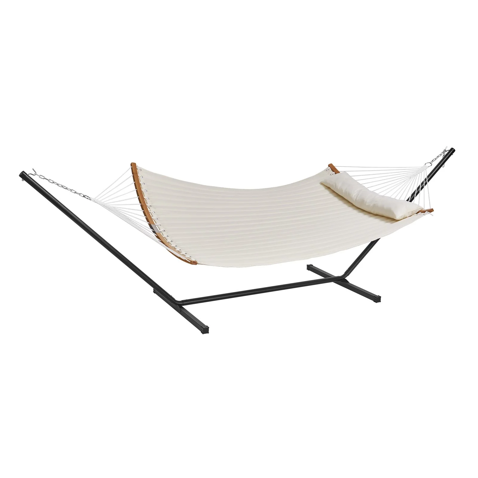 Our double quilted hammock with spreader bars offers a variety of colors and styles, making it perfect for your backyard, garden, patio, poolside, and more. Effortlessly set up and pack away, use it with trees or a hammock stand, and turn your place into a delightful retreat.