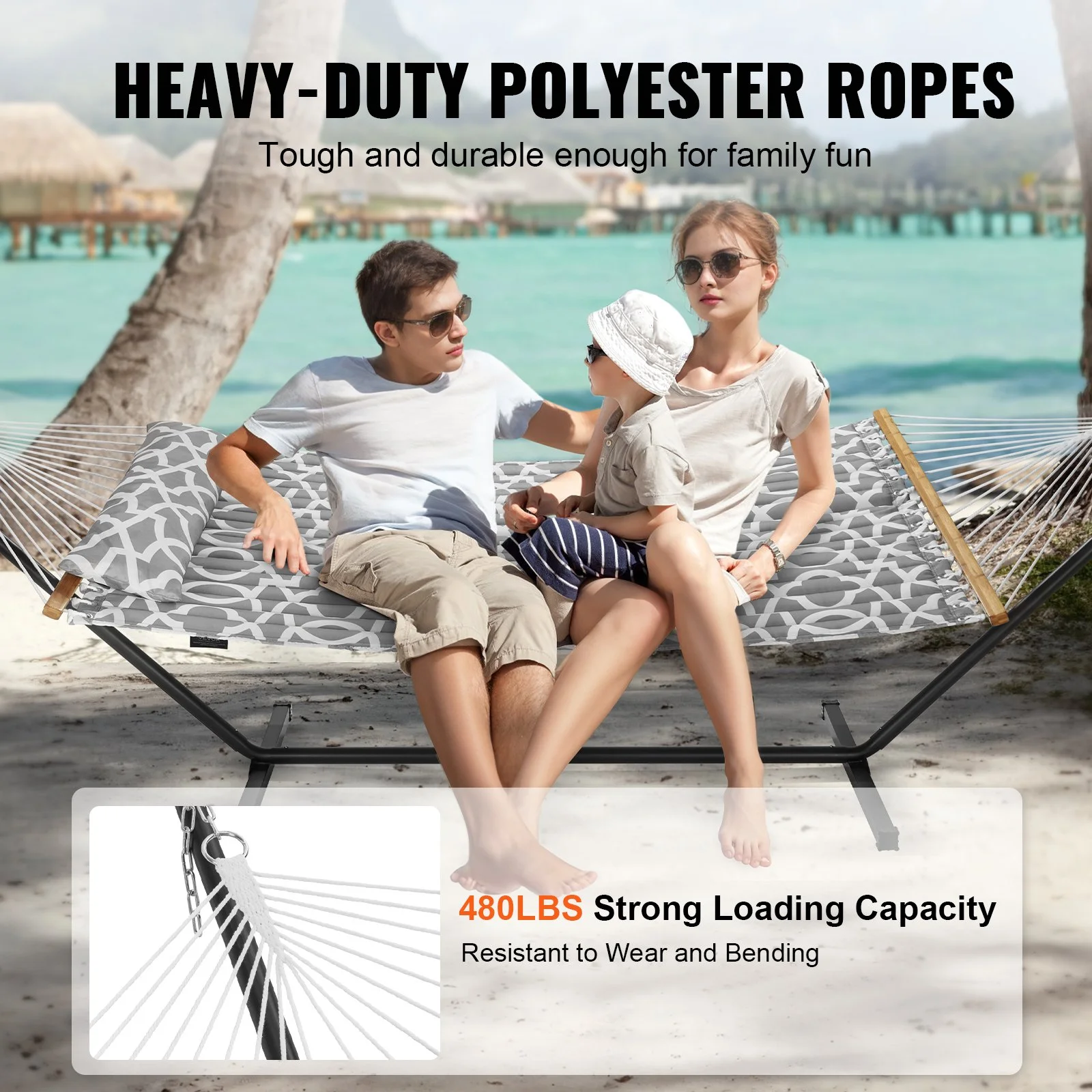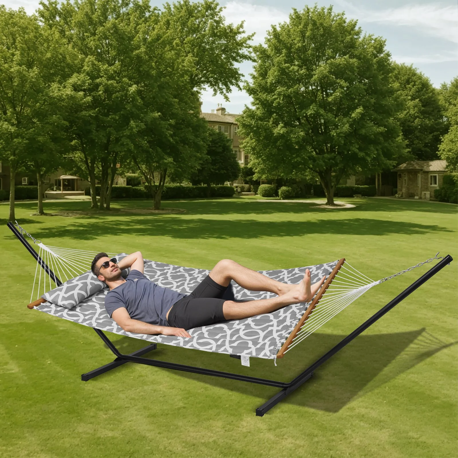 Our double quilted hammock with spreader bars offers a variety of colors and styles, making it perfect for your backyard, garden, patio, poolside, and more. Effortlessly set up and pack away, use it with trees or a hammock stand, and turn your place into a delightful retreat.