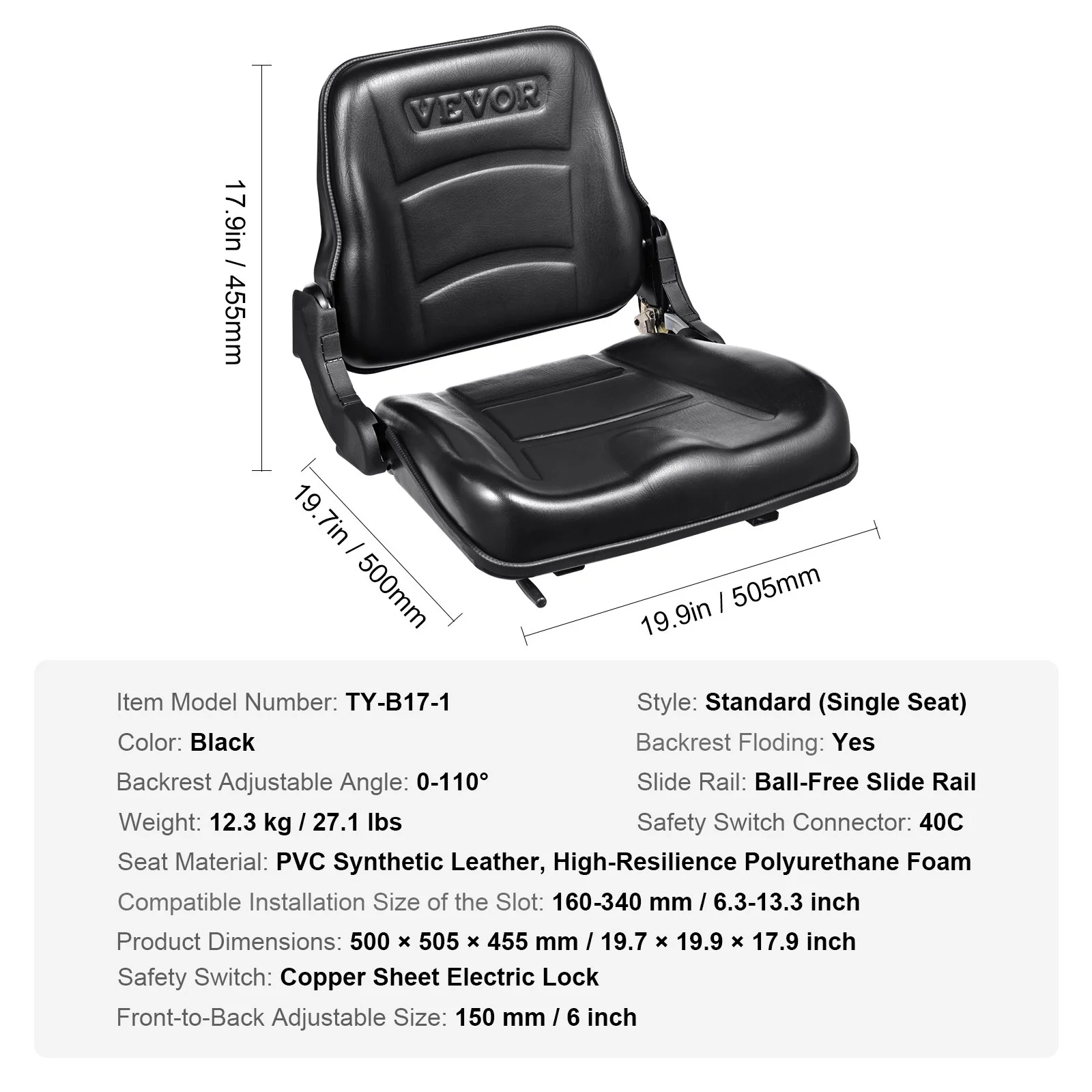 The forklift seat has an extended slot adjustment range of 6.3"-13.4", compatible with a variety of forklift types, from small manual forklifts to large diesel forklifts. Especially useful in scenarios where you frequently switch forklifts, allowing your seat to move with the forklift. Boost your work efficiency by adapting the seat to different forklifts.