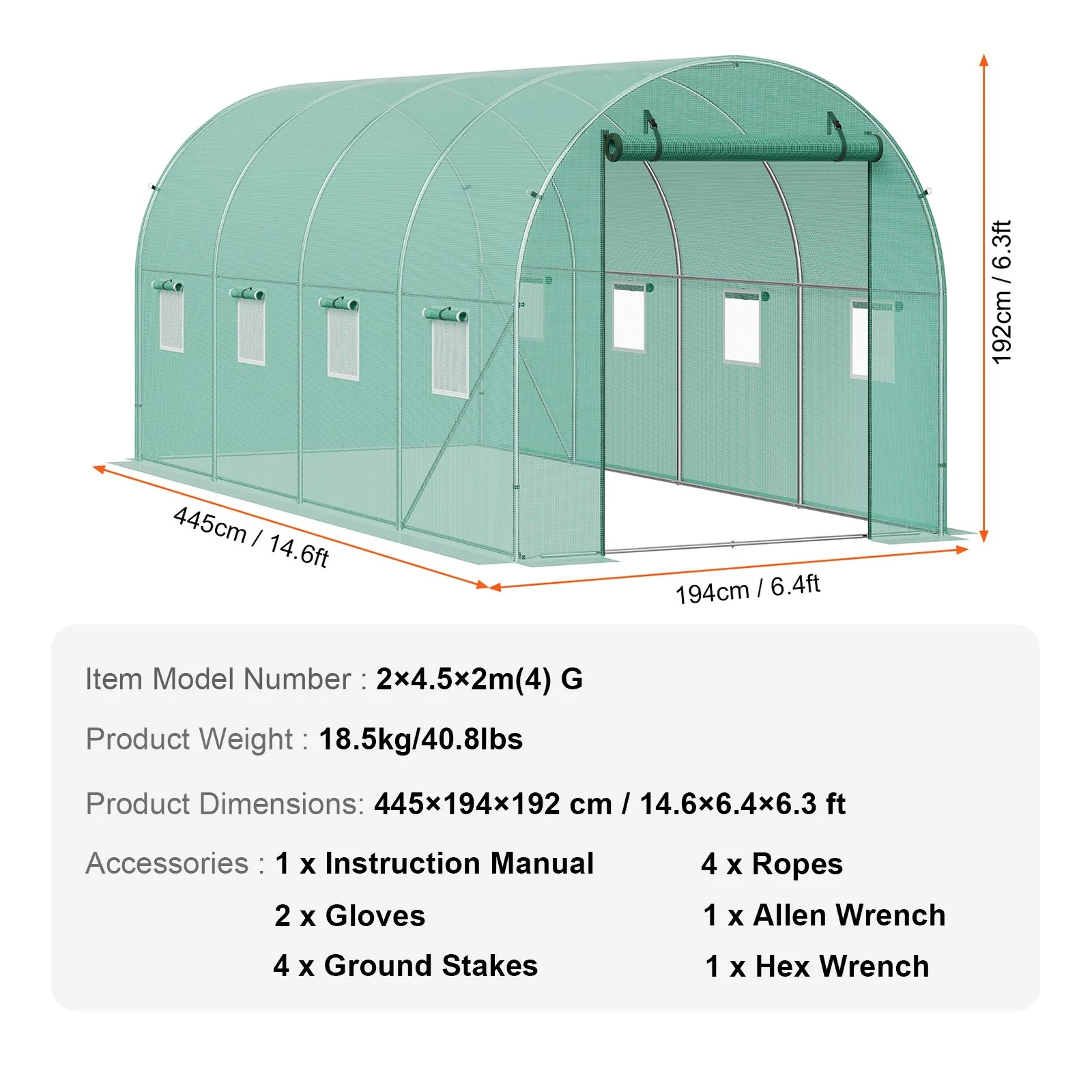 With a spacious 14.60x6.36x6.30 ft area, this walk-in greenhouse tunnel is ideal for growing a variety of plants. You can easily access and maintain your plants, or set up multiple plant shelves to meet both home gardening and commercial planting needs.