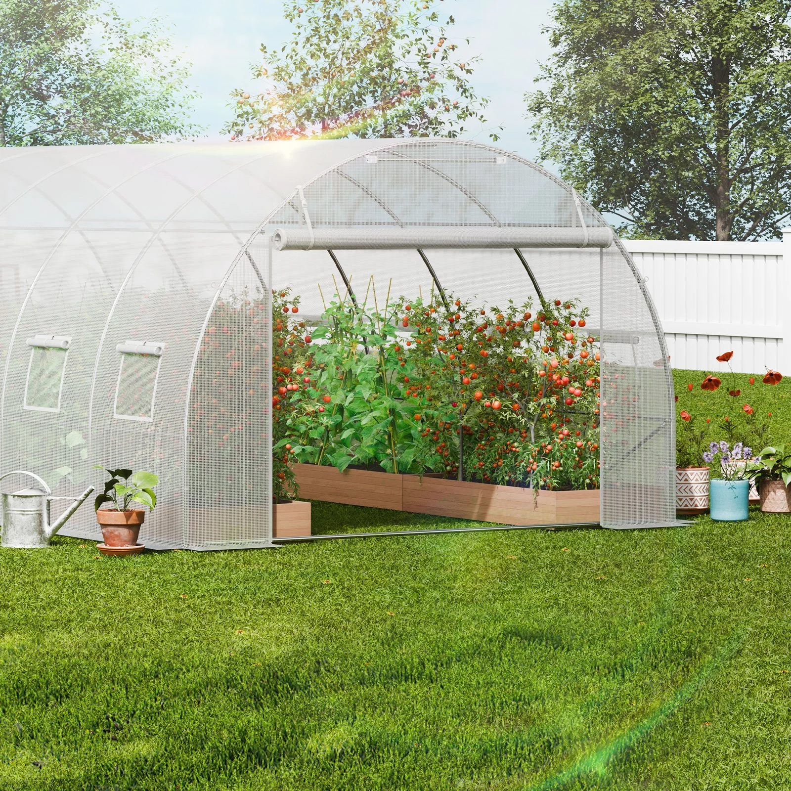 This hoop house greenhouse is equipped with 12 windows and a large zipper door to ensure excellent ventilation. The velcro on doors and windows allows for easy adjustment, while the mesh net prevents small creatures from entering, protecting plant health.