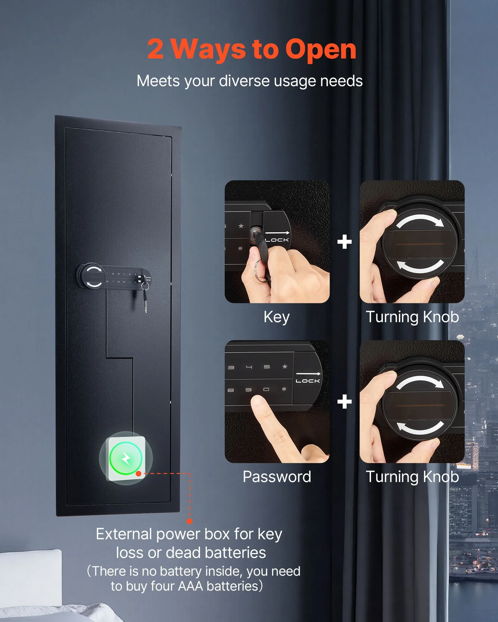 Our in wall safe features keys and password access for daily use and emergencies. If the key is lost or the battery dies, an external power box allows emergency unlocking, ensuring quick access to your valuables