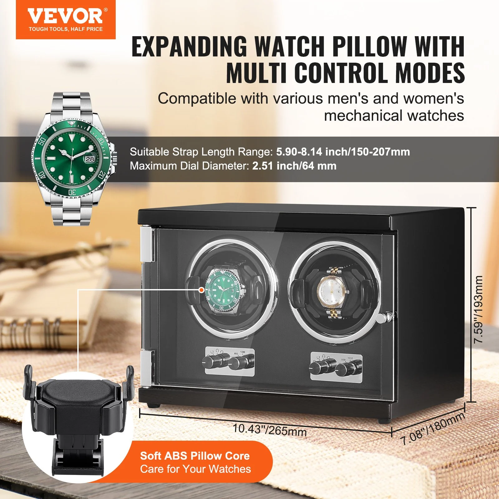 This high-quality watch winder features unique rotation modes that are compatible with most mechanical watches. The automatic watch winder supports watches with strap lengths ranging from 150-207mm (5.90-8.14 inches) and a maximum dial size of 64mm (2.51 inches). This means it's suitable for most men's and women's watches.