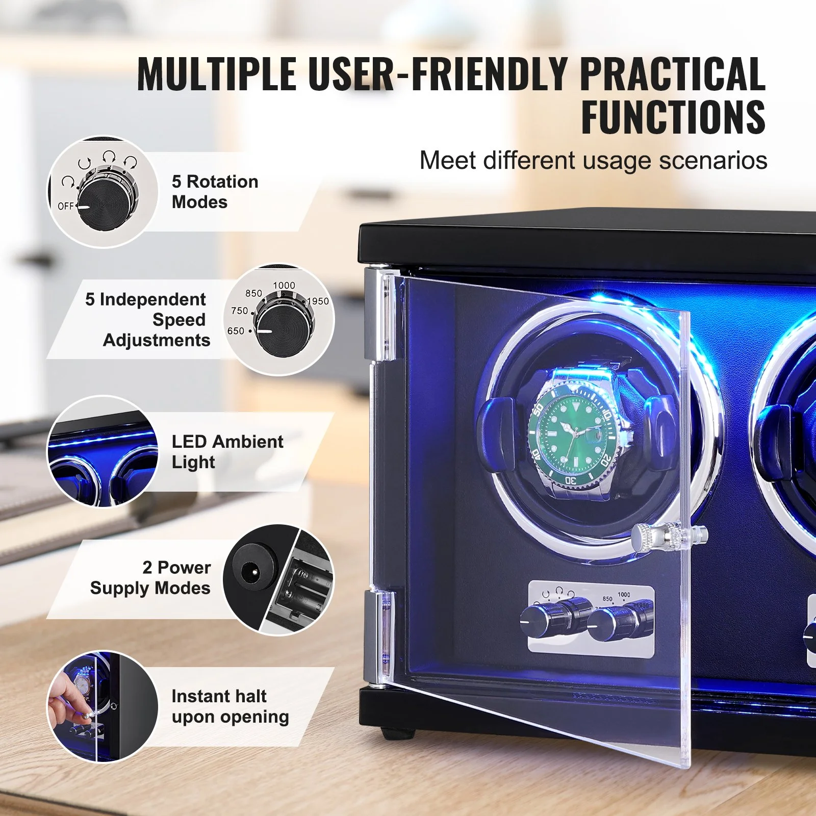 Our watch box winder features flexible watch pillows, accommodating watches with various strap lengths. The soft ABS material prevents scratches on your watches. The user-friendly open-lid stop function prevents unnecessary wear on the mechanism while allowing easy access to your watches. The LED blue light adds a touch of luxury, perfect for display and nighttime illumination. With two power supply modes, it's convenient for both home use and portability.