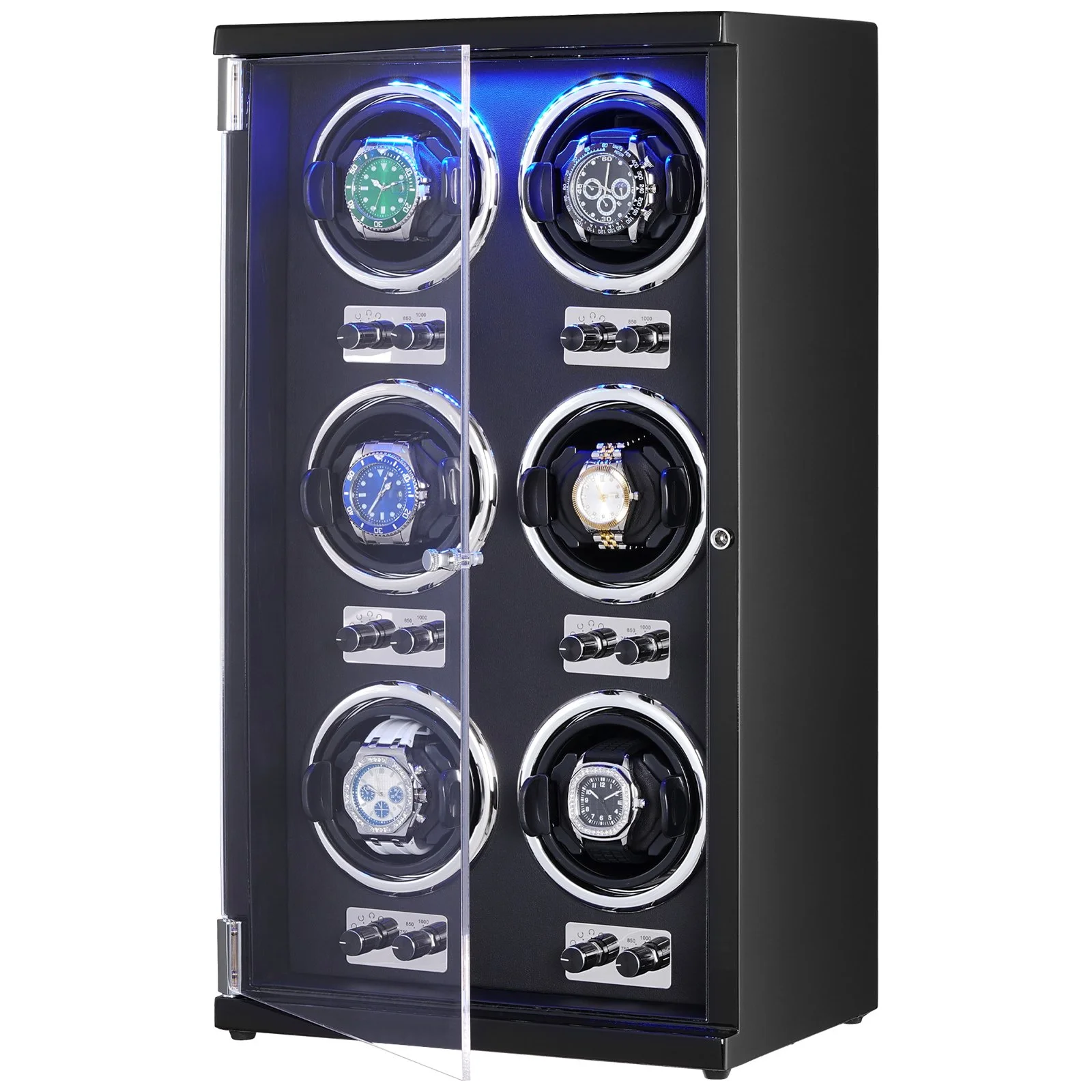 Our watch box winder features flexible watch pillows, accommodating watches with various strap lengths. The soft ABS material prevents scratches on your watches. The user-friendly open-lid stop function prevents unnecessary wear on the mechanism while allowing easy access to your watches. The LED blue light adds a touch of luxury, perfect for display and nighttime illumination. With two power supply modes, it's convenient for both home use and portability.