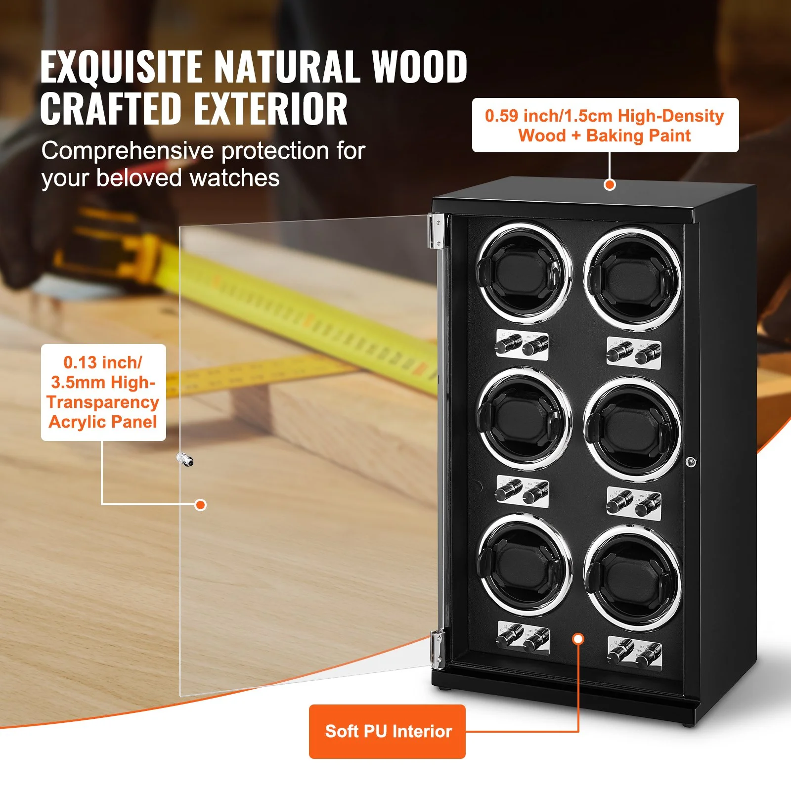 The outer box of the watch turner is crafted with thickened solid wood and a lacquer finish, combined with a high-transparency acrylic clasp door, enhancing texture and aesthetics. The PU interior protects your watches from scratches and impacts and is easy to clean. It is suitable for long-term use by watch enthusiasts and business professionals or as a thoughtful gift for friends and family.