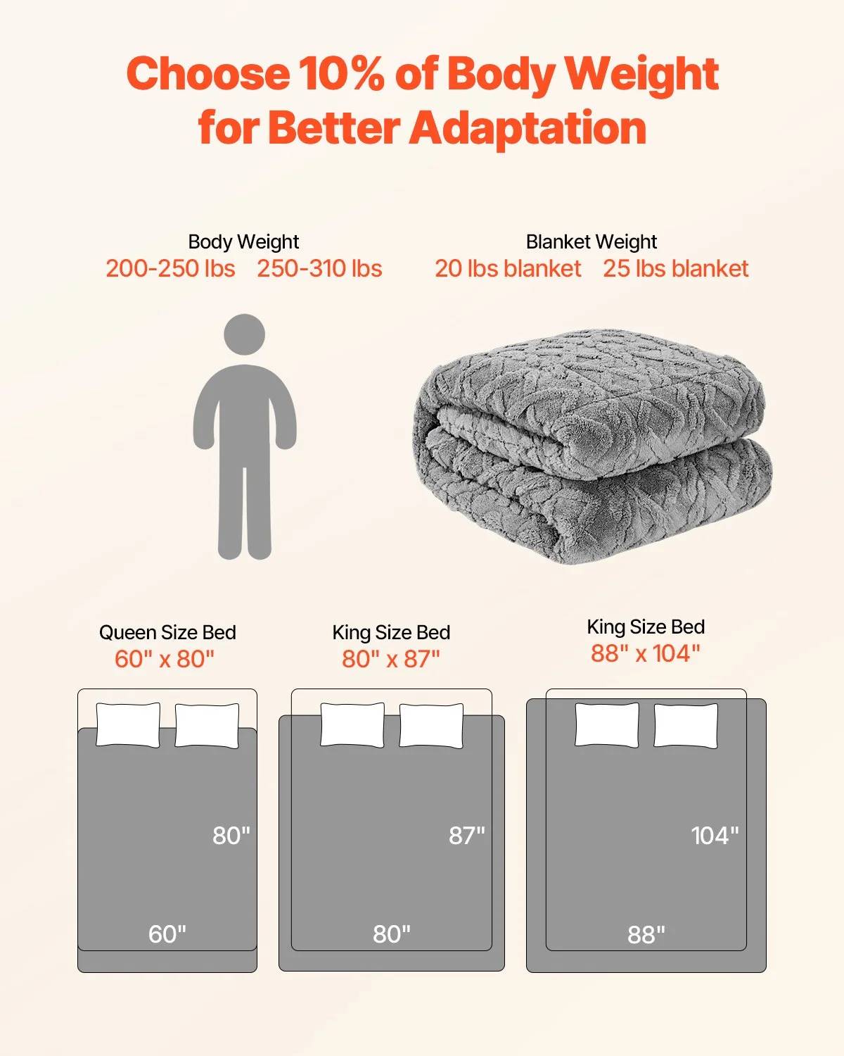 Choose a weighted blanket that’s 7%-10% of your body weight. For example, a 20 lbs / 9 kg blanket suits those weighing 200-250lbs / 90-113kg and can be shared by couples. Start light and adjust for comfort.