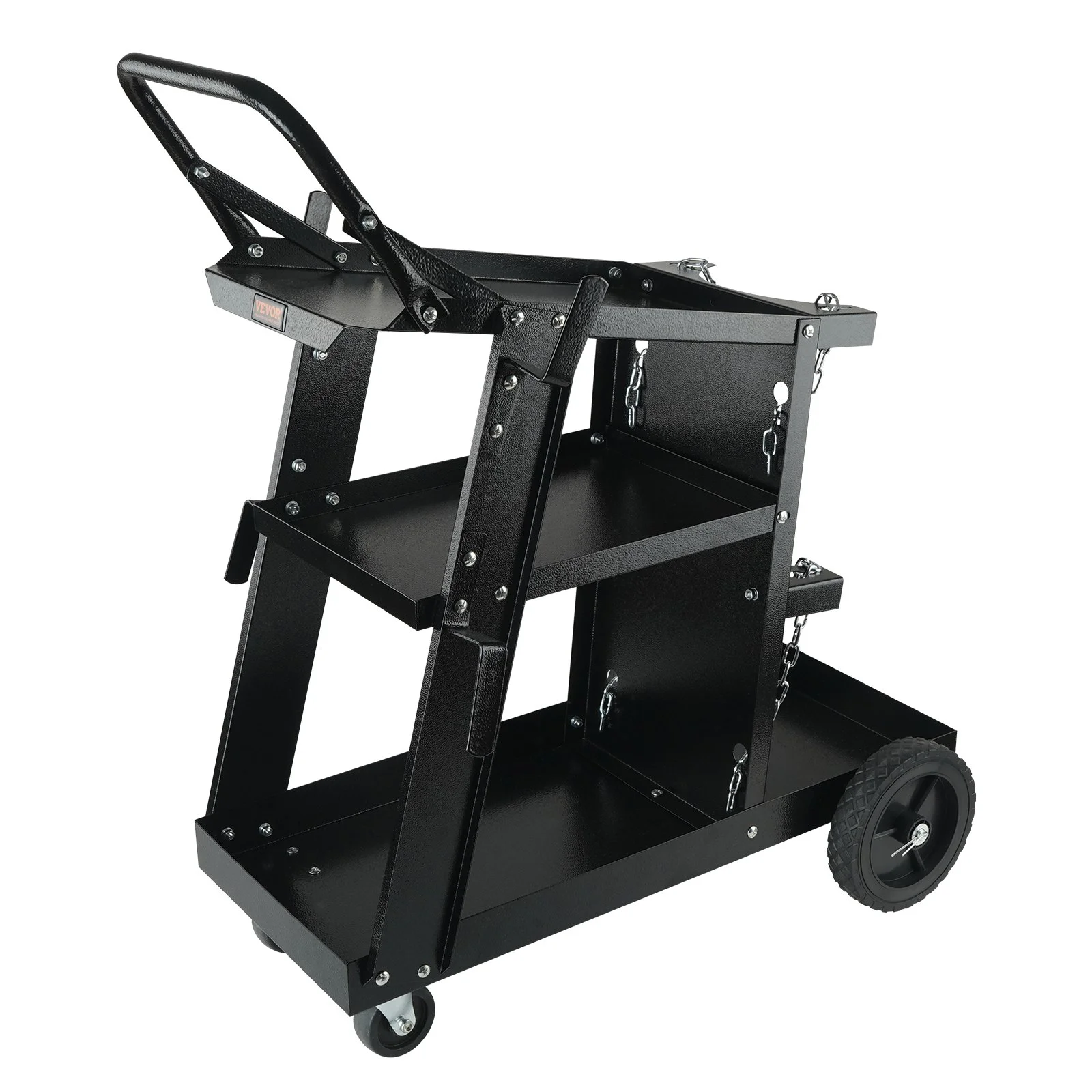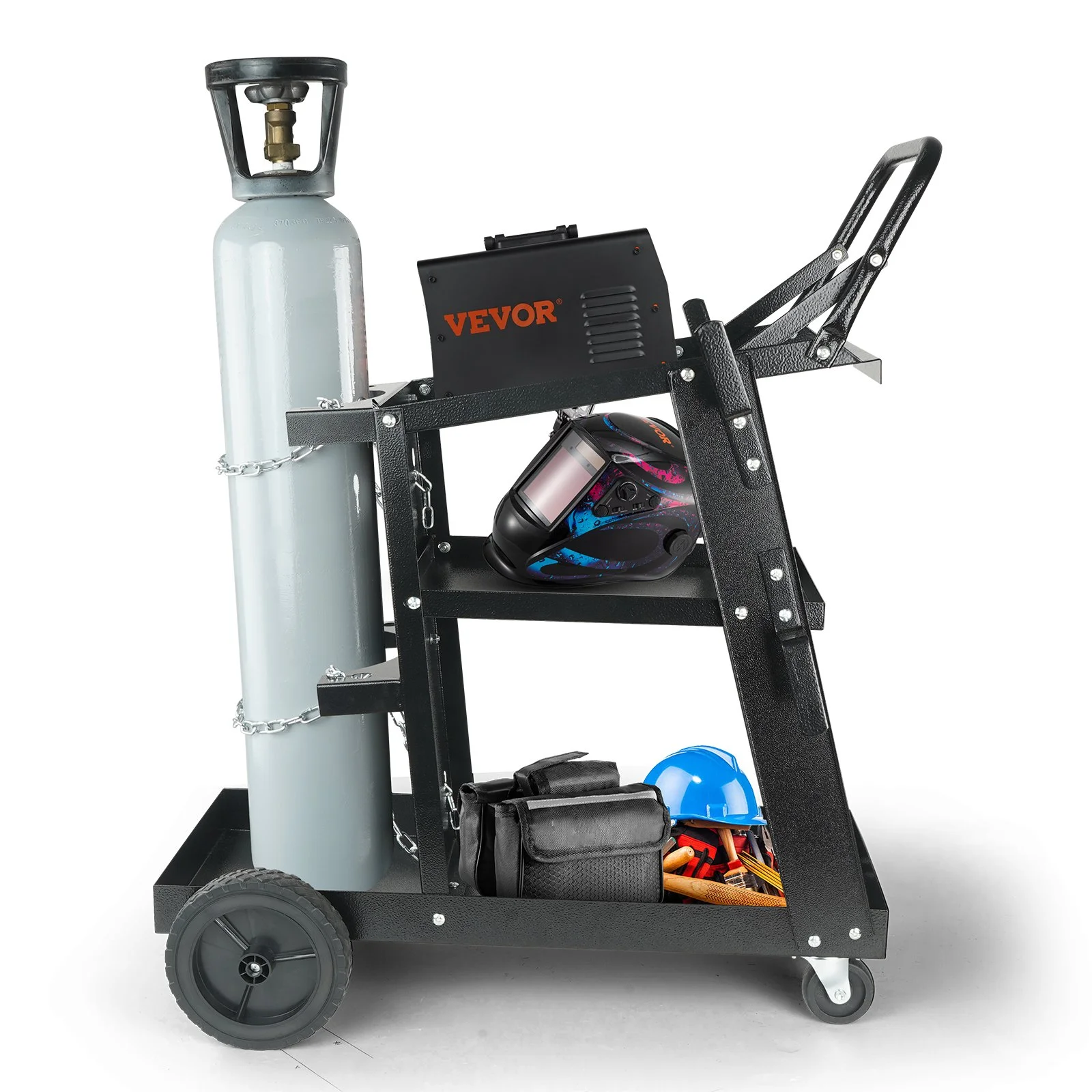 Large 3-tier MIG welder cart features a narrow top and a wide bottom, effortlessly accommodating welding caps, welding machines, gas cylinders, welding guns, tools, and more. 4 multi-functional brackets on the sides can hold welding guns, welding pliers, and other tools. Keep your welding tool within arm's reach and well tidy your space with VEVOR.