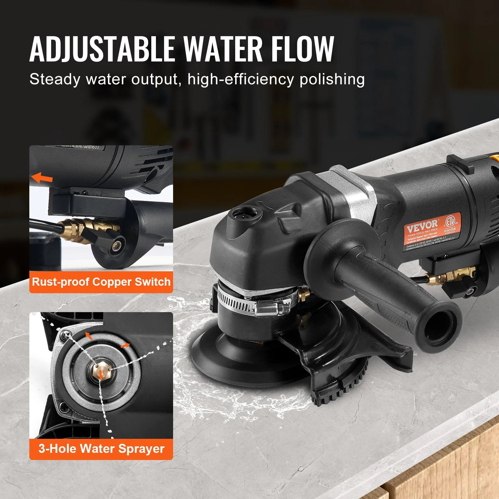 VEVOR wet stone polisher offers 6 variable speeds from 700 to 3000 RPM, making it versatile for various surfaces. Effortlessly tailor the speed to work with materials such as marble, granite, concrete, and tiles for a flawless finish.