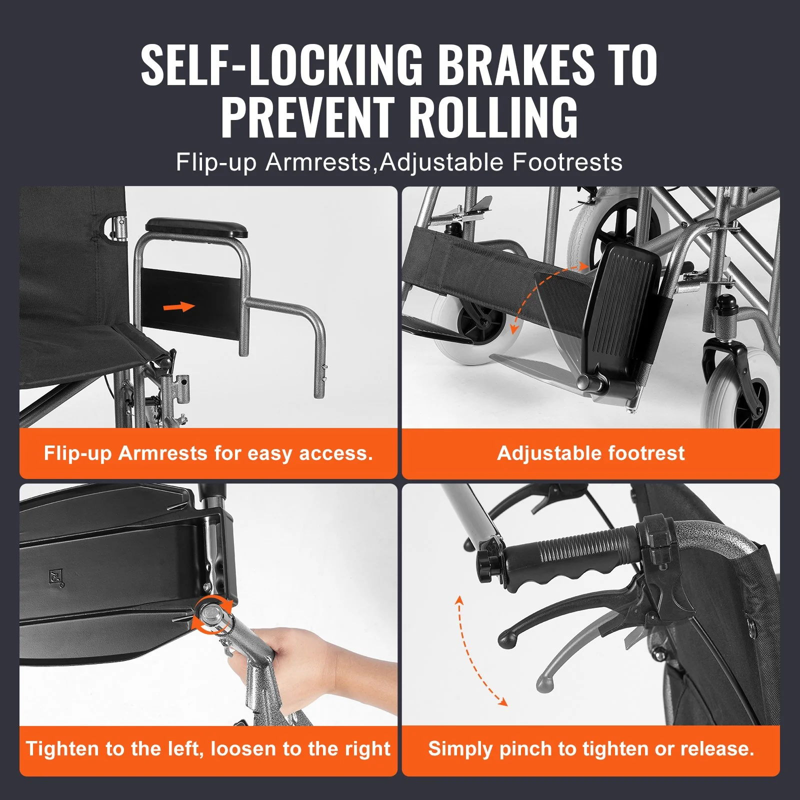 This wheelchair supports up to 300lbs with a spacious 24-inch wide seat, accommodating various body types. Carbon steel frame is sturdy and reliable, resistant to deformation, ensuring stable load-bearing capacity.