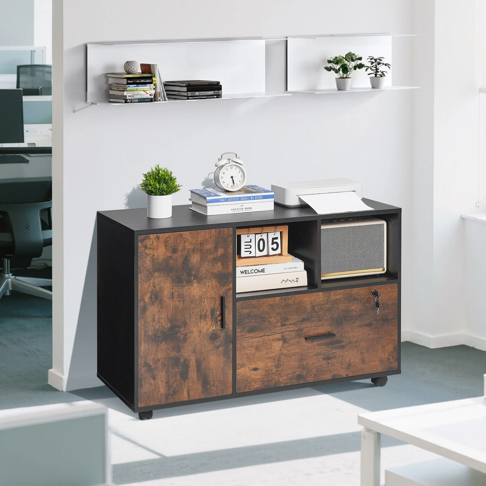 Say goodbye to cluttered workspaces! This wooden file cabinet holds books, documents, magazines, and more. The spacious desktop accommodates printers, scanners, fax machines, or decor-keeping your office tidy and organized