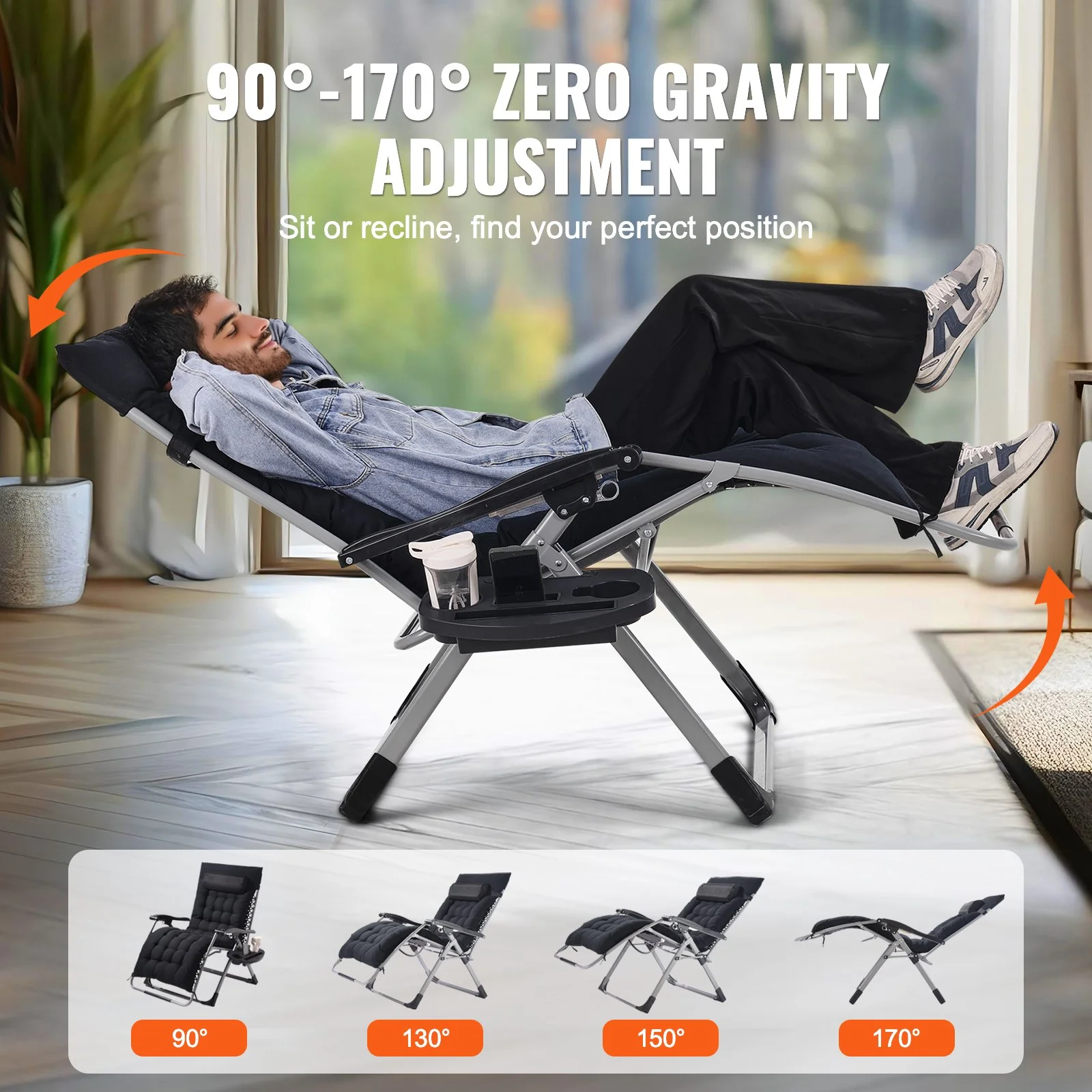 Customize your relaxation with our zero gravity recliner's adjustable design, ranging from 90° to 170°. Find your perfect position to effectively relieve stress and enjoy a cloud-like lounging experience.