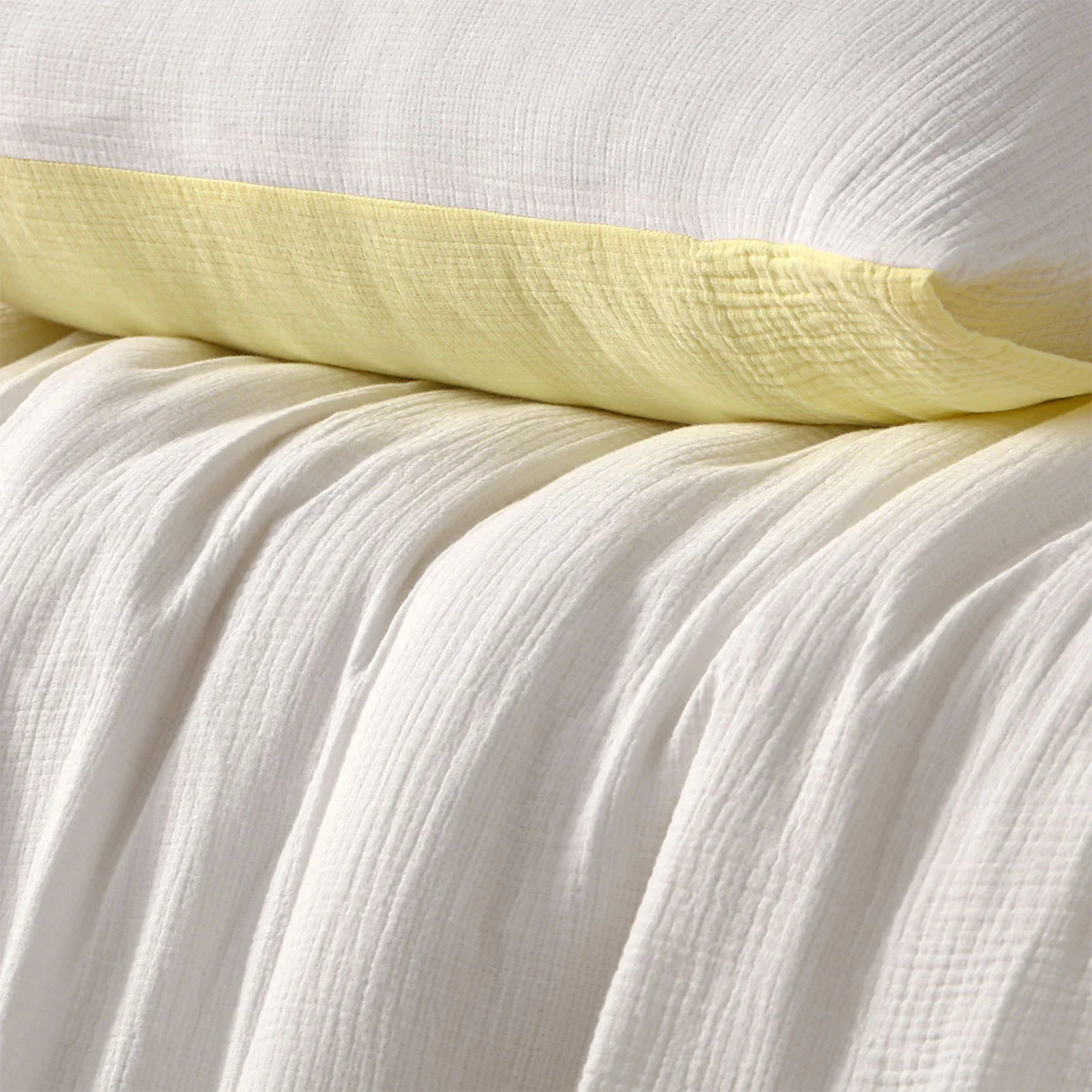 Create a completely new look and vibe to your bedroom's atmosphere with this gorgeous Hugo Reversible White Butter Cotton Gauze Quilt Cover Set by Vintage Design Homewares. The quilt cover features a classic solid colour design in soft colour hues of white and butter that will bring a contemporary looks to any bedroom. It is made from soft and comfortable 100% Cotton fabric with long lasting quality you can enjoy for years to come.