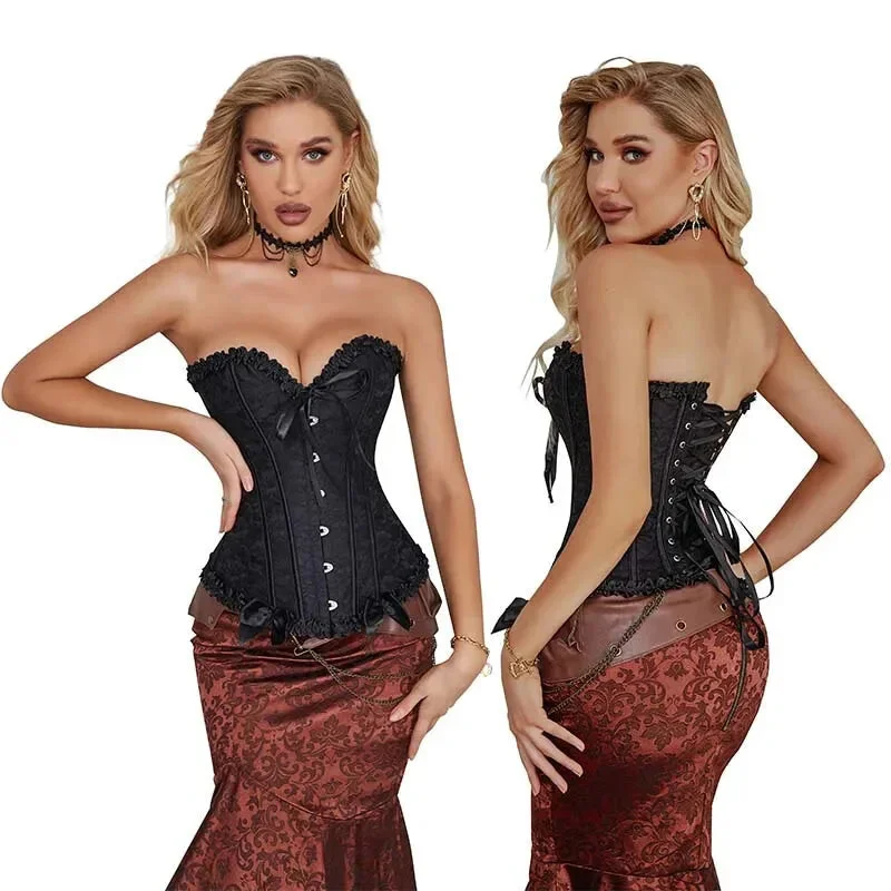 Vintage Floral Denim Corset Plus Size S-Xxl Lace Up Boned Overbust Fashionable - Black - Xl