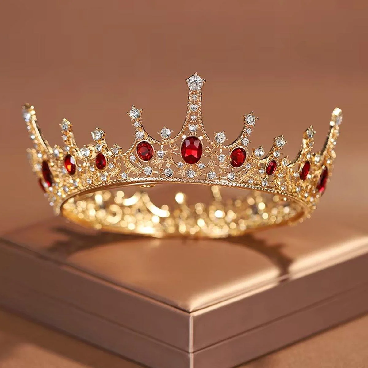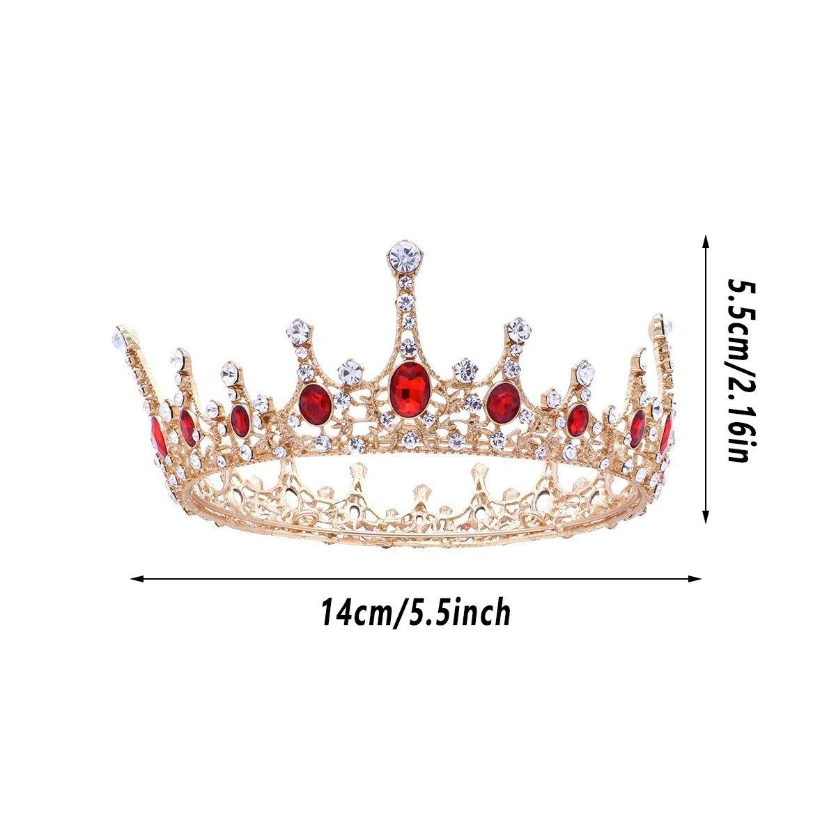 Elevate your bridal look with this exquisite vintage-inspired crown. Featuring a stunning combination of gold, white, and red crystals, this full-circle design exudes timeless elegance and royal charm. Perfect for weddings, proms, and special occasions, this crown enhances any formal ensemble with its sparkling and sophisticated style. Its comfortable fit ensures you shine like royalty throughout your event.