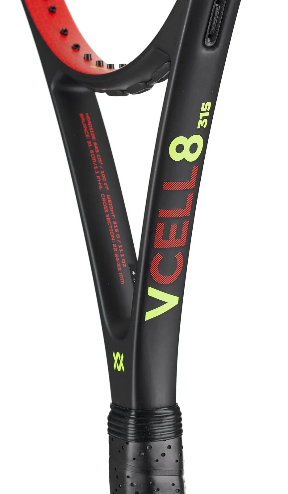 String Tension: 50-60 poundsThe V-Cell 8 315g replaces the V-Feel 8 model. Like its predecessor, this racquet was designed to give intermediate and advanced players a powerfully precise and spin-friendly weapon. At 11.6 ounces strung, it is a tad heavier and more stable than the V-Feel 8 300g, but it packs a sub 320-RDC swingweight, giving it explosive acceleration and impressive speed in the front court. For this update, Volk adds extra V-Cell material (a cellulose based carbon) to the shaft and head for a more comfortable, stable and responsive hitting experience.Like the previous generation, this racquet's butt cap and innovative REVA based handle system have been meticulously designed to deliver a smoother, more arm-friendly feel at impact. On groundstrokes, this stick swings faster than its competitors, making it great for the experienced player who craves raw speed over stability. The open 16x18 string pattern not only translates into spin-loaded missiles that drop hard, it also delivers a higher trajectory for easier access to depth. Te speedy feel also makes it easy to chase down balls on defense or crank winners on the run. At net this stick offers a crisp and precise response along with very quick handling, making it great on reaction volleys. It also whips very powerfully through contact on serve to deliver easy targeting. With incremental tweaks to the feel, this update is continues to be a great option for aggressive players looking to load the ball with pace and spin.