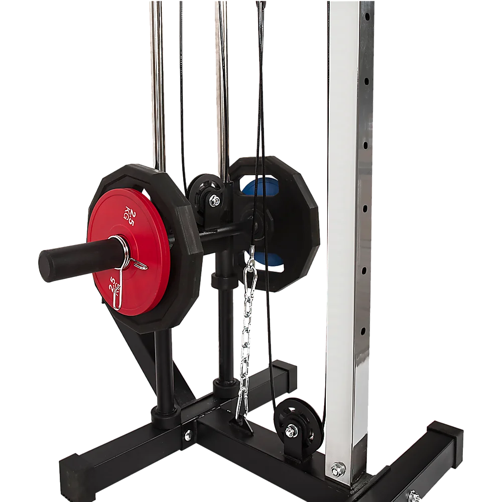 Made from strong, steel frame with a protective powder-coated finish that fends off scratches and rust, this cable tower is equipped with two premium pulleys that can be effortlessly adjusted to varying heights, facilitating a wide spectrum of exercises, from cable crossovers to lat pulldowns.
