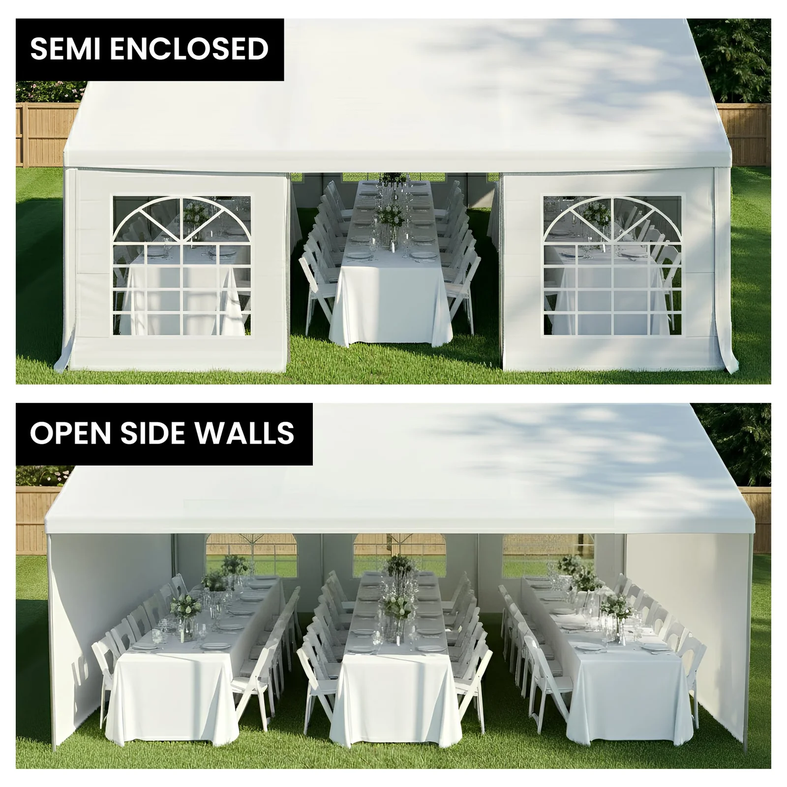 This multi-configuration pavilion suits all occasions. Each side can be quickly fitted or just leave some off for an open design. The end wall has a zip-up door with a 1.8m clearance which you can tie open or leave closed.