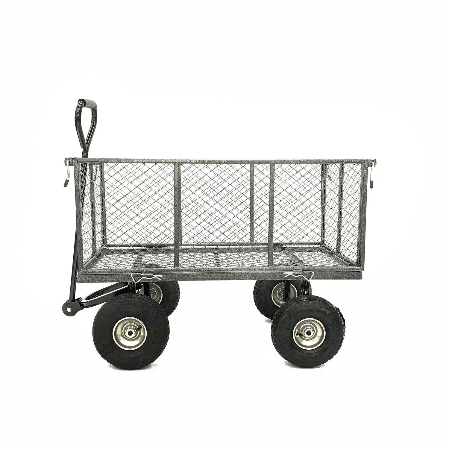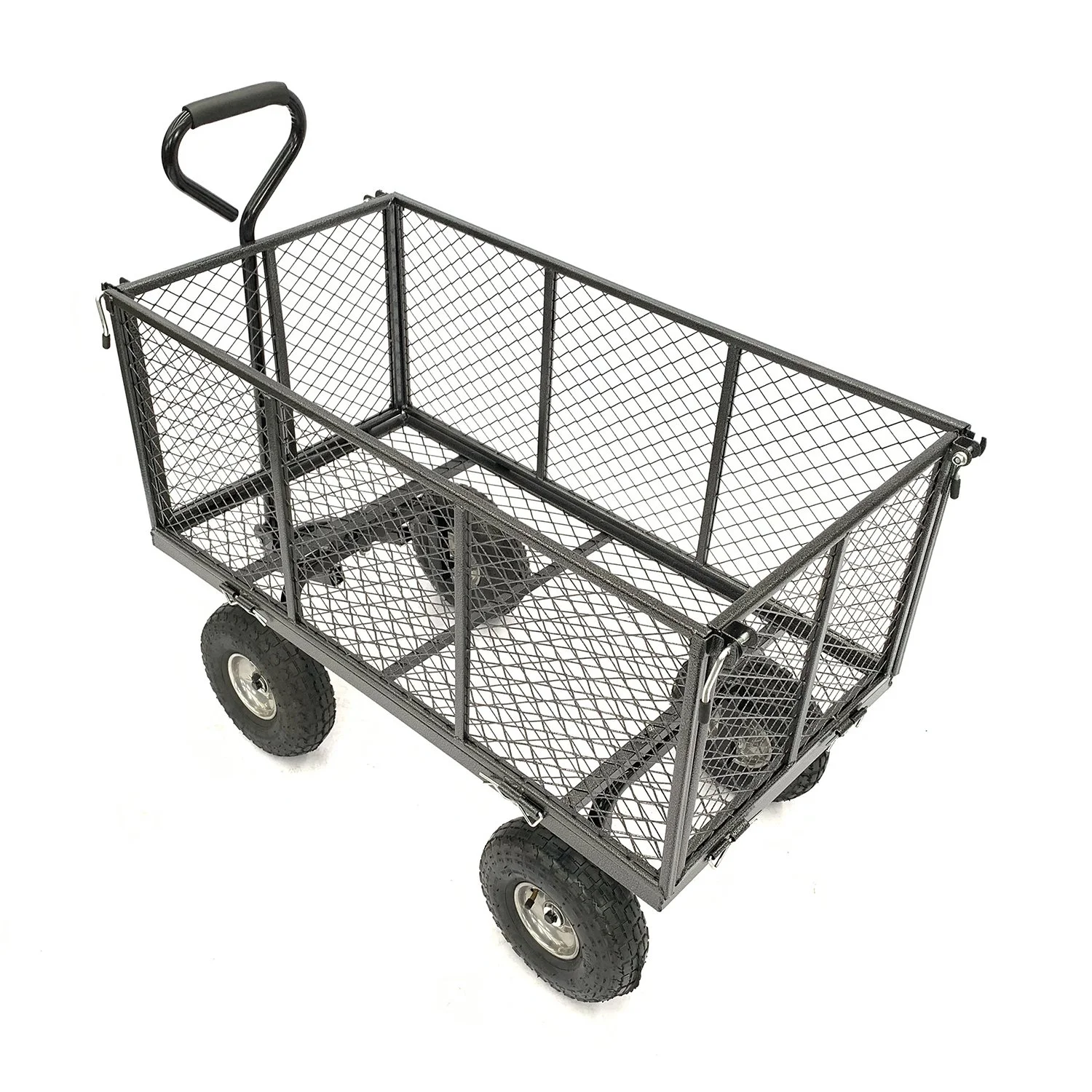 The heavy-gauge steel mesh sides can be folded down or removed, allowing you to use the cart as a flatbed trolley. Now you can easily haul wider loads such as tiles, slabs and pallets. The garden cart also uses rack and pinion steering, which means tight turns are no problem. And the padded handle is comfortable to pull, even when the cart is fully loaded.