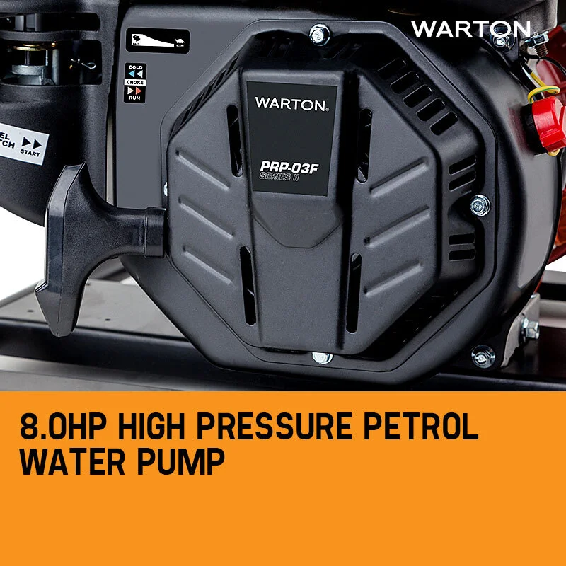 The New Warton 8.0HP 1.5 Inch High Pressure Petrol Water Pump has landed and is already becoming the most demanded portable pump solution by Aussies and Kiwis alike! This water pump series will provide outstanding performance for general water pumping applications. Whether it's for heavy duty cleaning, irrigating the garden, pumping out a flooded cellar or firefighting, you'll be amazed with the versatility and performance of the Warton 8.0HP Petrol Water Pump.