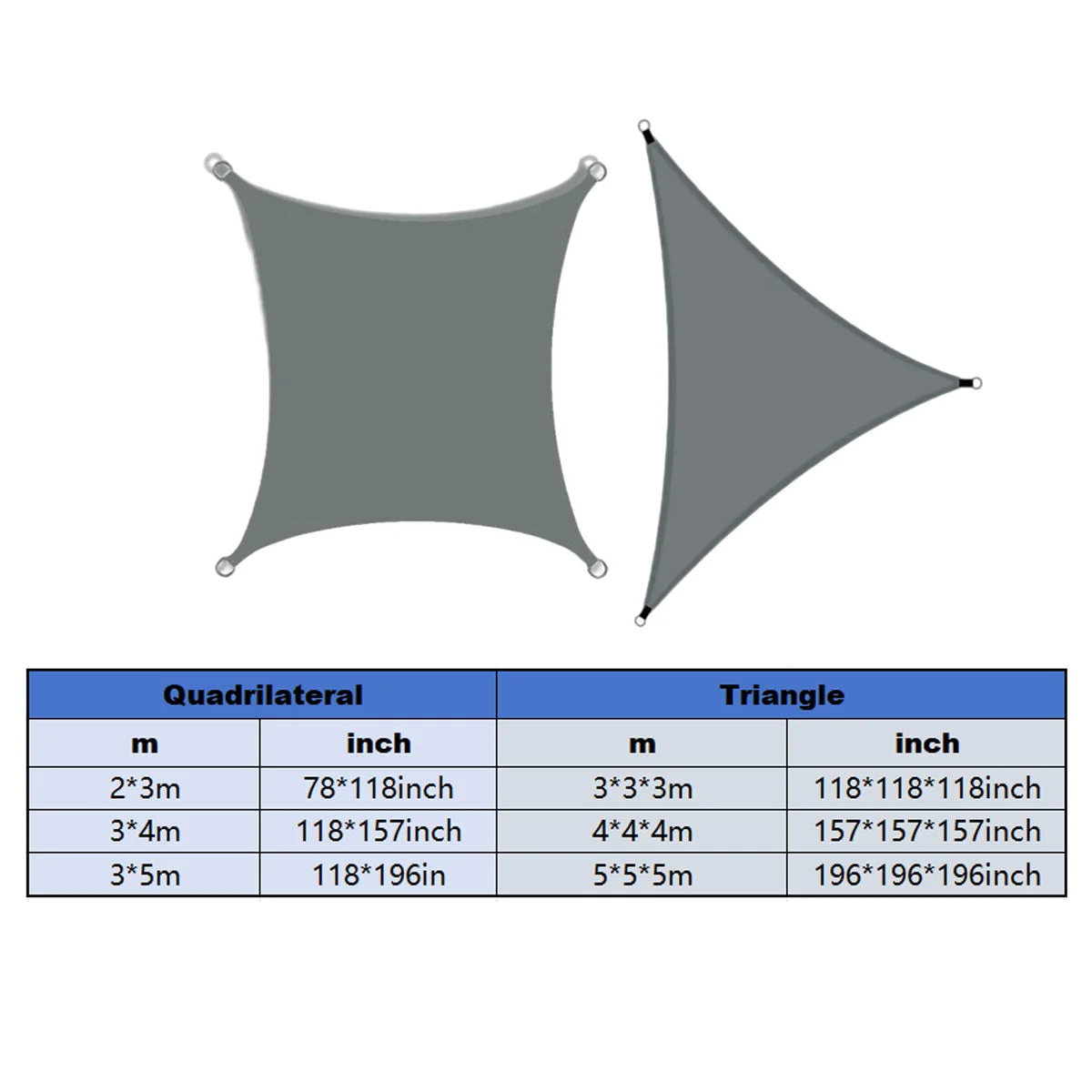 Quadrilateral: 2x3m (78x118in), 3x4m (118x157in), 3x5m (118x196in)