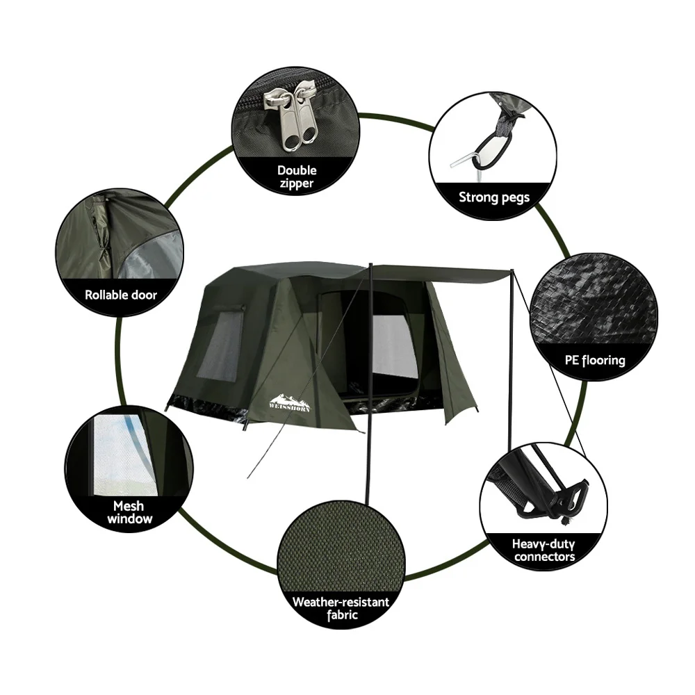 Embrace nature's call with our 2-3 person Weisshorn Instant Camping Tent. Designed for the true outdoor enthusiast, its robust polyester fly stands as a barrier against unpredictable weather with UV protection and PU1500 water resistance. The tent features an instant and integrated frame for easy pitching and pack-up. Welded floor corners provide additional weather protection. Wide windows and a central door seamlessly merge the inside with the ambient sounds and coolness of the outdoors and can be rolled up for even better ventilation. A double-sided zipper ensures you can get in and out with ease. With a generous front vestibule and built-in storage pockets, your adventure equipment finds a safe shelter. Dive deeper into nature's wonders with a Weisshorn Instant Camping Tent.