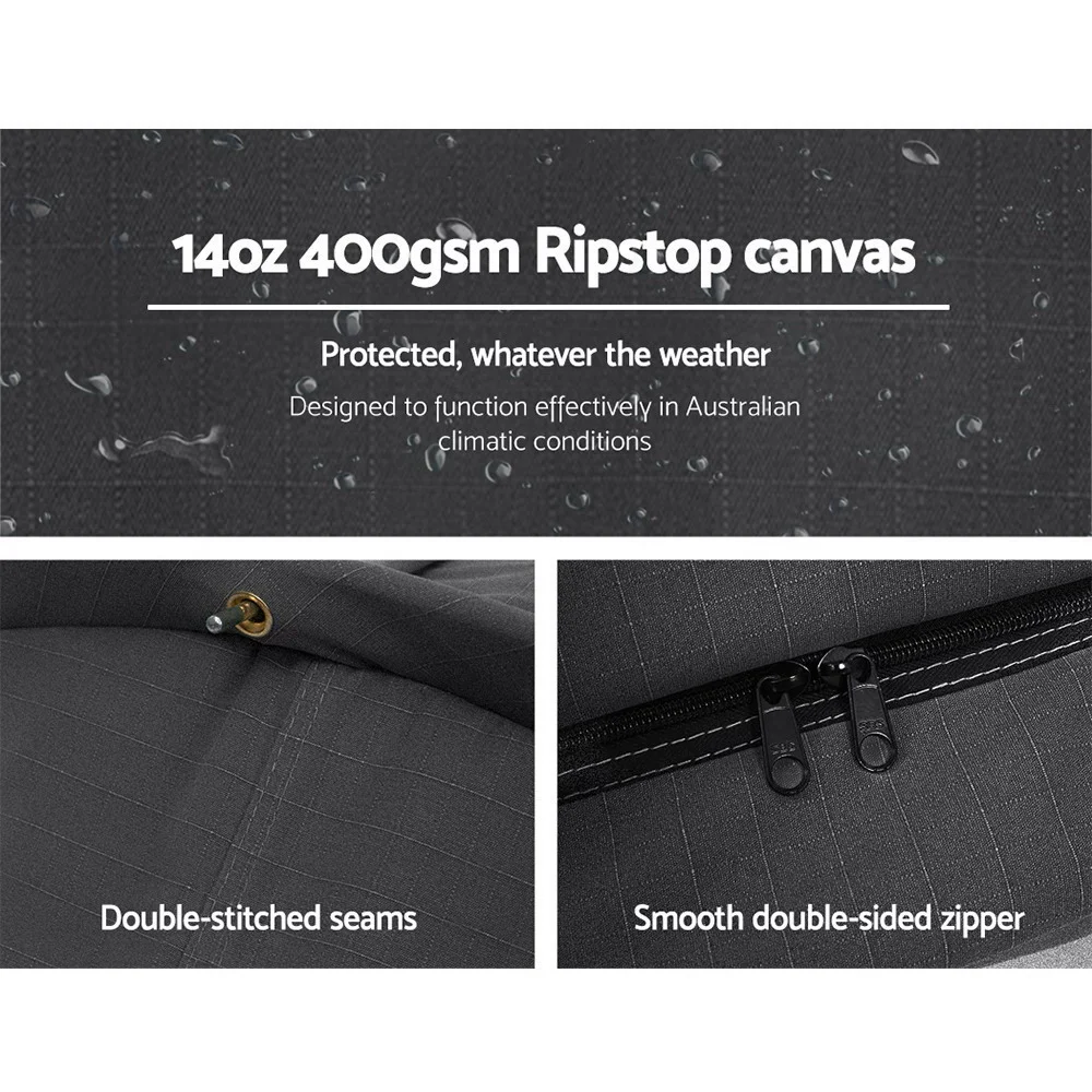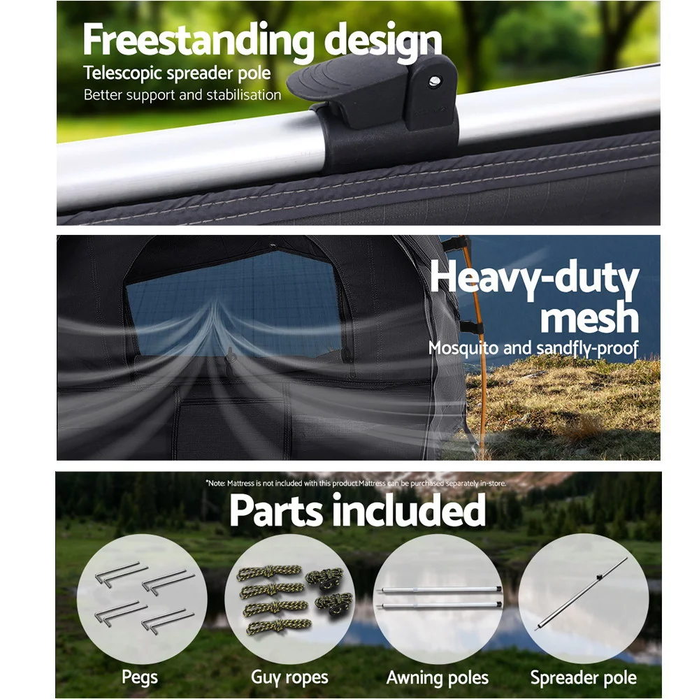 A 14oz 400gsm water-repellent Rip stop canvas cover, 500gsm PVC flooring and an extra 10cm high edge all round. Swagspeak for the ultimate tear-resistant waterproofing. Fully enclosed for privacy with zipped openings for fresh air anytime. Mesh panels to keep insects out.Thick aluminium support poles to hold up the entire set up.