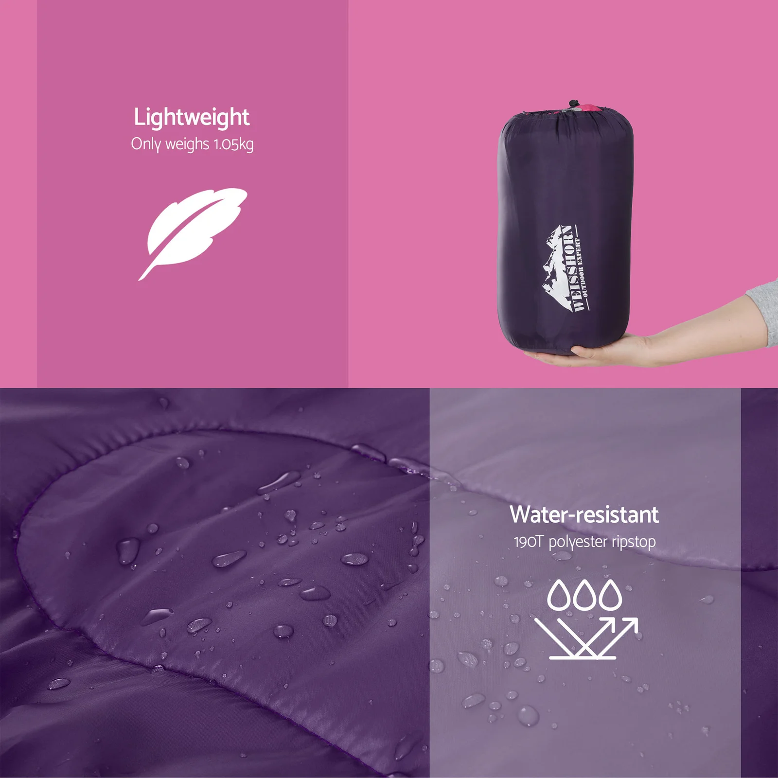 Don't let the chill ruin your next family holiday. Your kids can have a comfortable night's sleep in any weather with a Weisshorn 172cm Children's Thermal Sleeping Bag. Suitable for temperatures between -5 and 20 degrees, the sleeping bag will keep your children cosy during long, cool nights. Filled with 250gsm hollow fibre filling and lined with soft polyester pongee fabric, the sleeping bag is soft, lightweight and water-resistant. It features an adjustable tightening strap, a secure Velcro closure, double-opening zippers and a convenient carry bag. The sleeping bag can also be used as a play or picnic mat when you need a soft surface for outdoor fun. The sleeping bag has a bright, colourful design that your kids will love. When you're out camping with the family and need more warmth, rug up with a Weisshorn Children's Thermal Sleeping Bag.