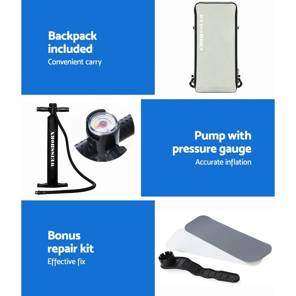 Our Weisshorn Stand-up Paddle Board is designed to suit the beginner paddler as well as a seasoned and easily fits both paddler and passenger for hours of maximum enjoyment. Better still, it is made from durable drop-stitch core material and easy to inflate and deflate, with similar build qualities that you will find with its pricier fibreglass counterparts. It maintains rigidity and toughness with a thickness of 15cm and has a weight capacity of up to 185kg. The supplied 1.7m adjustable aluminium paddle is highly versatile in both paddling and steering while the three fins underneath the board ensure steady gliding, easy manoeuvrability and smooth turning. In fact, one of the fins is removable to give better directional stability. Getting your aquatic escapades started with the paddle board is a simple task of inflating it with the included pump and you are good to row. And because it can be packed away into its handy travel bag, you can take the paddle board just about anywhere you want to go for your water adventures. Also included is a repair kit and a quality adjustable kayak seat that can turn your paddle board into a kayak to enhance your comfort. The kayak seat also comes with a storage pocket where you can conveniently place your personal belongings.