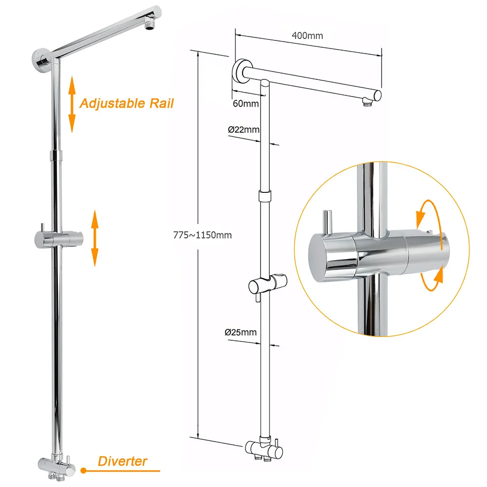 - Materials: Stainless steel in rail, plastic in shower holder, brass in diverter