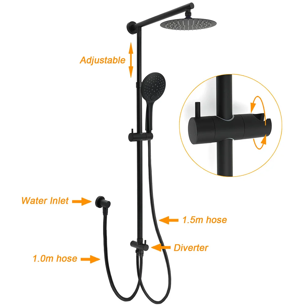 - Materials: Stainless steel in rail, plastic in shower holder, brass in diverter